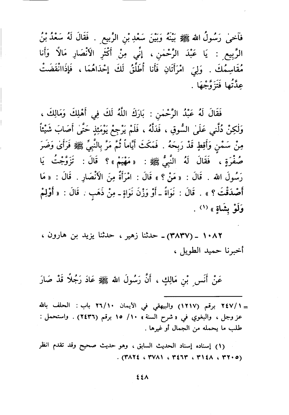 3837 - حَدَّثَنَا زُهَيْرٌ، حَدَّثَنَا يَزِيدُ بْنُ هَارُونَ، أَخْبَرَنَا حُمَيْدٌ الطَّوِيلُ، عَنْ أَنَسِ بْنِ مَالِكٍ، أَنَّ رَسُولَ اللَّهِ صَلَّى اللهُ عَلَيْهِ وَسَلَّمَ عَادَ رَجُلًا قَدْ صَارَ مِثْلَ الْفَرْخِ الْمَنْتُوفِ فَقَالَ: «هَلْ كُنْتَ تَدْعُو بِشَيْءٍ أَوْ تَسْأَلُهُ؟»، قَالَ: قُلْتُ: اللَّهُمَّ مَا كُنْتَ مُعَاقِبِي بِهِ فِي الْآخِرَةِ فَعَجِّلْهُ لِي فِي الدُّنْيَا، فَقَالَ رَسُولُ اللَّهِ صَلَّى اللهُ عَلَيْهِ وَسَلَّمَ: " سُبْحَانَ اللَّهِ، إِذًا لَا تُطِيقُ ذَلِكَ وَلَا تَسْتَطِيعُهُ، فَلَوْلَا قُلْتَ: §رَبِّنَا آتِنَا فِي الدُّنْيَا حَسَنَةً، وَفِي الْآخِرَةِ حَسَنَةً وَقِنَا عَذَابَ النَّارِ "Kإسناده صحيح على شرط الشيخين