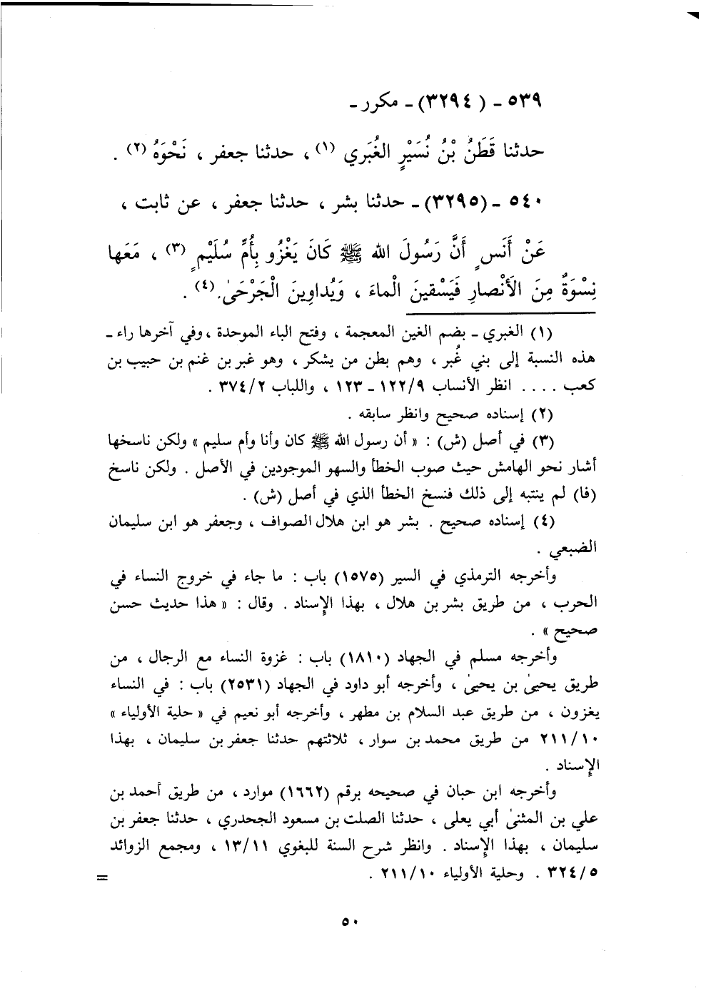 3295 - حَدَّثَنَا بِشْرٌ، حَدَّثَنَا جَعْفَرٌ، عَنْ ثَابِتٍ، عَنْ أَنَسٍ، أَنَّ رَسُولَ اللَّهِ صَلَّى اللهُ عَلَيْهِ وَسَلَّمَ «كَانَ §يَغْزُو بِأُمِّ سُلَيْمٍ» مَعَهَا نِسْوَةٌ مِنَ الْأَنْصَارِ، فَيَسْقِينَ الْمَاءَ وَيُدَاوِينَ الْجَرْحَىKإسناده صحيح
