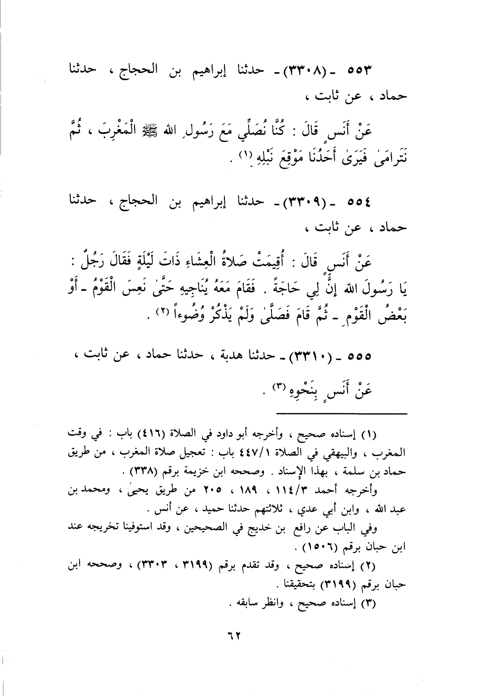 3308 - حَدَّثَنَا إِبْرَاهِيمُ بْنُ الْحَجَّاجِ، حَدَّثَنَا حَمَّادٌ، عَنْ ثَابِتٍ، عَنْ أَنَسٍ، قَالَ: «كُنَّا §نُصَلِّي مَعَ رَسُولِ اللَّهِ صَلَّى اللهُ عَلَيْهِ وَسَلَّمَ الْمَغْرِبَ، ثُمَّ نَتَرَامَى فَيَرَى أَحَدُنَا مَوْقِعَ نَبْلِهِ» Kإسناده صحيح