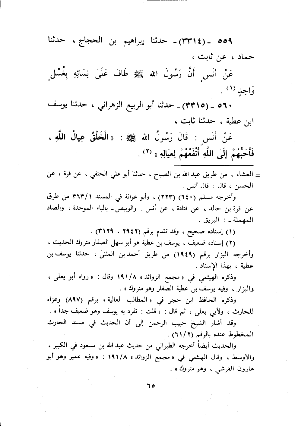 3315 - حَدَّثَنَا أَبُو الرَّبِيعِ الزَّهْرَانِيُّ، حَدَّثَنَا يُوسُفُ بْنُ عَطِيَّةَ، حَدَّثَنَا ثَابِتٌ، عَنْ أَنَسٍ، قَالَ رَسُولُ اللَّهِ صَلَّى اللهُ عَلَيْهِ وَسَلَّمَ: «§الْخَلْقُ عِيَالُ اللَّهِ، فَأَحَبُّهُمْ إِلَى اللَّهِ أَنْفَعُهُمْ لِعِيَالِهِ» Kإسناده ضعيف
