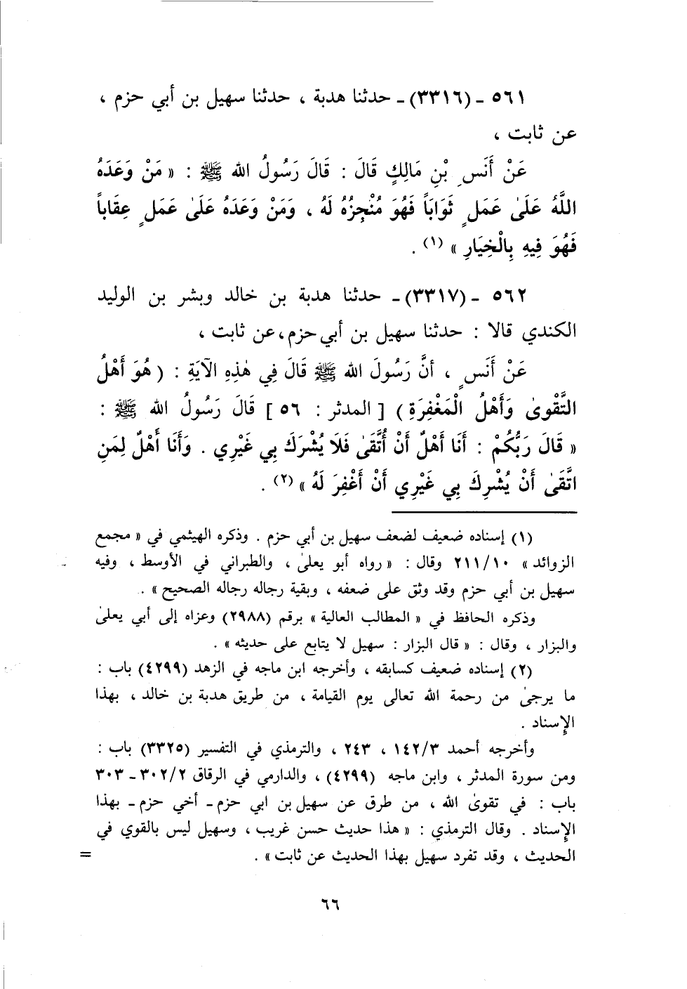 3317 - حَدَّثَنَا هُدْبَةُ بْنُ خَالِدٍ، وَبِشْرُ بْنُ الْوَلِيدِ الْكِنْدِيُّ، قَالَا: حَدَّثَنَا سُهَيْلُ بْنُ أَبِي حَزْمٍ، عَنْ ثَابِتٍ، عَنْ أَنَسٍ، أَنَّ رَسُولَ اللَّهِ صَلَّى اللهُ عَلَيْهِ وَسَلَّمَ قَالَ فِي هَذِهِ الْآيَةِ: {هُوَ أَهْلُ التَّقْوَى وَأَهْلُ الْمَغْفِرَةِ} [المدثر: 56] قَالَ رَسُولُ اللَّهِ صَلَّى اللهُ عَلَيْهِ وَسَلَّمَ: " قَالَ رَبُّكُمْ: §أَنَا أَهْلٌ أَنْ أُتَّقَى فَلَا يُشْرَكُ بِي غَيْرِي، وَأَنَا أَهْلٌ لِمَنِ اتَّقَى أَنْ يُشْرِكَ بِي غَيْرِي أَنْ أَغْفِرَ لَهُ "Kإسناده ضعيف