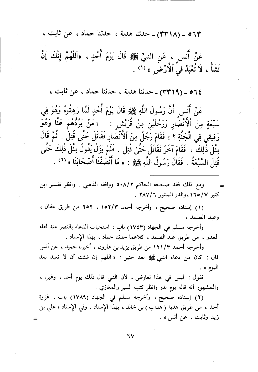 3318 - حَدَّثَنَا هُدْبَةُ، حَدَّثَنَا حَمَّادٌ، عَنْ ثَابِتٍ، عَنْ أَنَسٍ، عَنِ النَّبِيِّ صَلَّى اللهُ عَلَيْهِ وَسَلَّمَ قَالَ يَوْمَ أُحُدٍ: «§اللَّهُمَّ إِنَّكَ إِنْ تَشَأْ لَا تُعْبَدْ فِي الْأَرْضِ» Kإسناده صحيح