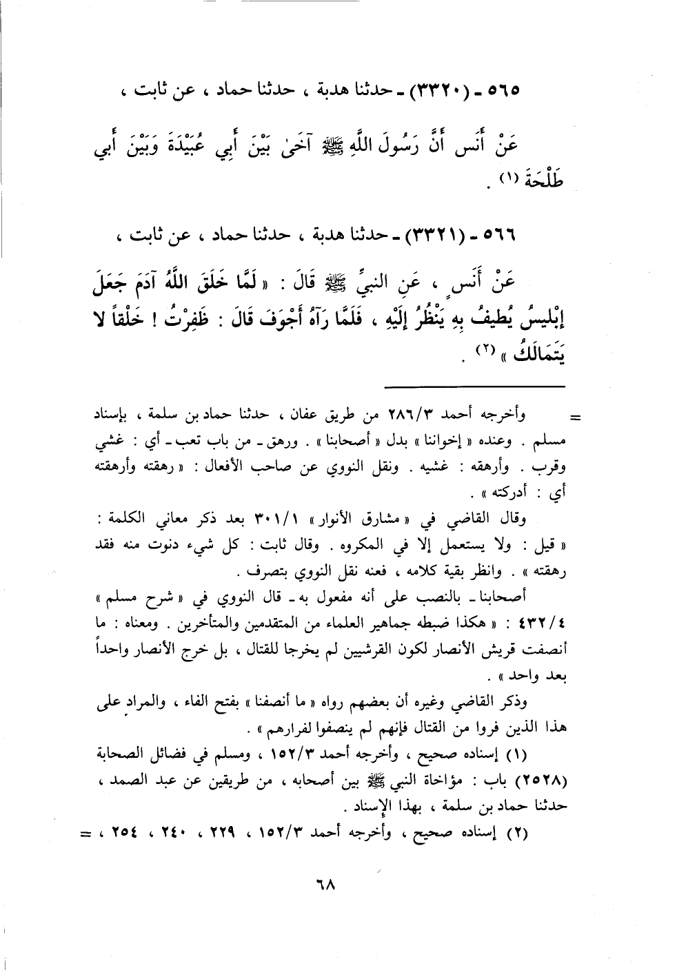 3320 - حَدَّثَنَا هُدْبَةُ، حَدَّثَنَا حَمَّادٌ، عَنْ ثَابِتٍ، عَنْ أَنَسٍ، أَنَّ رَسُولَ اللَّهِ صَلَّى اللهُ عَلَيْهِ وَسَلَّمَ «§آخَى بَيْنَ أَبِي عُبَيْدَةَ وَبَيْنَ أَبِي طَلْحَةَ» Kإسناده صحيح