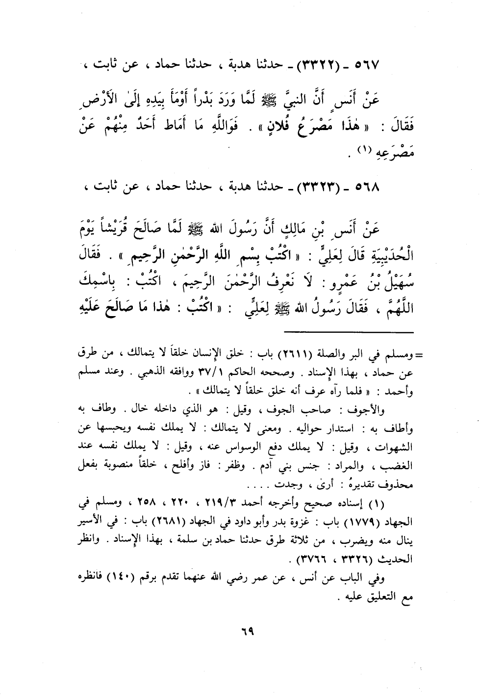 3323 - حَدَّثَنَا هُدْبَةُ، حَدَّثَنَا حَمَّادٌ، عَنْ ثَابِتٍ، عَنْ أَنَسِ بْنِ مَالِكٍ، أَنَّ رَسُولَ اللَّهِ صَلَّى اللهُ عَلَيْهِ وَسَلَّمَ لَمَّا صَالَحَ قُرَيْشًا يَوْمَ الْحُدَيْبِيَةَ قَالَ لِعَلِيٍّ: «§اكْتُبْ بِسْمِ اللَّهِ الرَّحْمَنِ الرَّحِيمِ». فَقَالَ سُهَيْلُ بْنُ عَمْرٍو: لَا نَعْرِفُ الرَّحْمَنَ الرَّحِيمَ، اكْتُبْ: بِاسْمِكَ اللَّهُمَّ، فَقَالَ رَسُولُ اللَّهِ صَلَّى اللهُ عَلَيْهِ وَسَلَّمَ لِعَلِيٍّ: " اكْتُبْ: هَذَا مَا صَالَحَ عَلَيْهِ مُحَمَّدٌ رَسُولُ اللَّهِ ". فَقَالَ سُهَيْلُ بْنُ عَمْرٍو: لَوْ نَعْلَمُ أَنَّكَ رَسُولُ اللَّهِ لَاتَّبَعْنَاكَ وَلَمْ نُكَذِّبْكَ، اكْتُبْ نَسَبَكَ مِنْ أَبِيكَ، فَقَالَ النَّبِيُّ صَلَّى اللهُ عَلَيْهِ وَسَلَّمَ لِعَلِيٍّ: " اكْتُبْ: مُحَمَّدَ بْنَ عَبْدِ اللَّهِ ". فَكَتَبَ: مَنْ أَتَانَا مِنْكُمْ رَدَدْنَاهُ إِلَيْكُمْ، وَمَنْ أَتَاكُمْ مِنَّا تَرَكْنَاهُ عَلَيْكُمْ. فَقَالُوا: يَا رَسُولَ اللَّهِ تُعْطِيهِمْ هَذَا؟ قَالَ: «مَنْ أَتَاهُمْ مِنَّا فَأَبْعَدَهُ اللَّهُ، وَمَنْ أَتَانَا مِنْهُمْ فَرَدَدْنَاهُ عَلَيْهِمْ جَعَلَ اللَّهُ لَهُ فَرَجًا وَمَخْرَجًا» Kإسناده صحيح