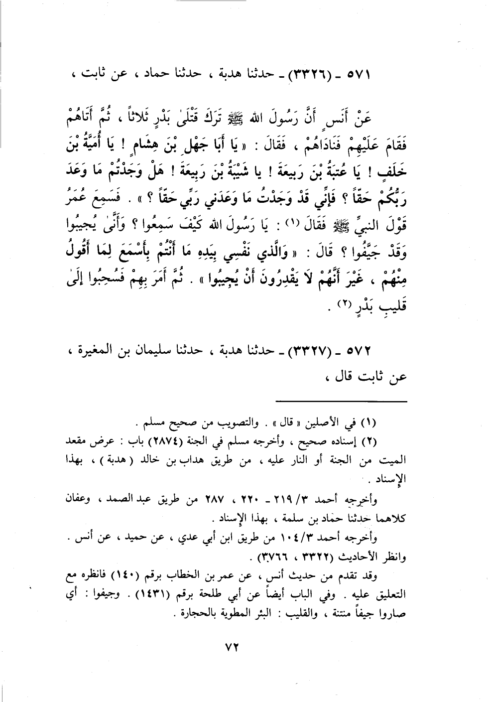 3326 - حَدَّثَنَا هُدْبَةُ، حَدَّثَنَا حَمَّادٌ، عَنْ ثَابِتٍ، عَنْ أَنَسٍ، أَنَّ رَسُولَ اللَّهِ صَلَّى اللهُ عَلَيْهِ وَسَلَّمَ تَرَكَ قَتْلَى بَدْرٍ ثَلَاثًا، ثُمَّ أَتَاهُمْ فَقَامَ عَلَيْهِمْ فَنَادَاهُمْ، فَقَالَ: «يَا أَبَا جَهْلِ بْنَ هِشَامٍ، يَا أُمَيَّةُ بْنَ خَلَفٍ، يَا عُتْبَةُ بْنَ رَبِيعَةَ، يَا شَيْبَةُ بْنَ رَبِيعَةَ، §هَلْ وَجَدْتُمْ مَا وَعَدَ رَبُّكُمْ حَقًّا؟ فَإِنِّي قَدْ وَجَدْتُ مَا وَعَدَنِي رَبِّي حَقًّا؟» فَسَمِعَ عُمَرُ قَوْلَ النَّبِيِّ صَلَّى اللهُ عَلَيْهِ وَسَلَّمَ فَقَالَ: يَا رَسُولَ اللَّهِ، كَيْفَ سَمِعُوا؟ وَأَنَّى يُجِيبُوا وَقَدْ جَيَّفُوا؟ قَالَ: «وَالَّذِي نَفْسِي بِيَدِهِ، مَا أَنْتُمْ بِأَسْمَعَ لَمَّا أَقُولُ مِنْهُمْ، غَيْرَ أَنَّهُمْ لَا يَقْدِرُونَ أَنْ يُجِيبُوا». ثُمَّ أَمَرَ بِهِمْ فَسُحِبُوا إِلَى قَلِيبِ بَدْرٍKإسناده صحيح