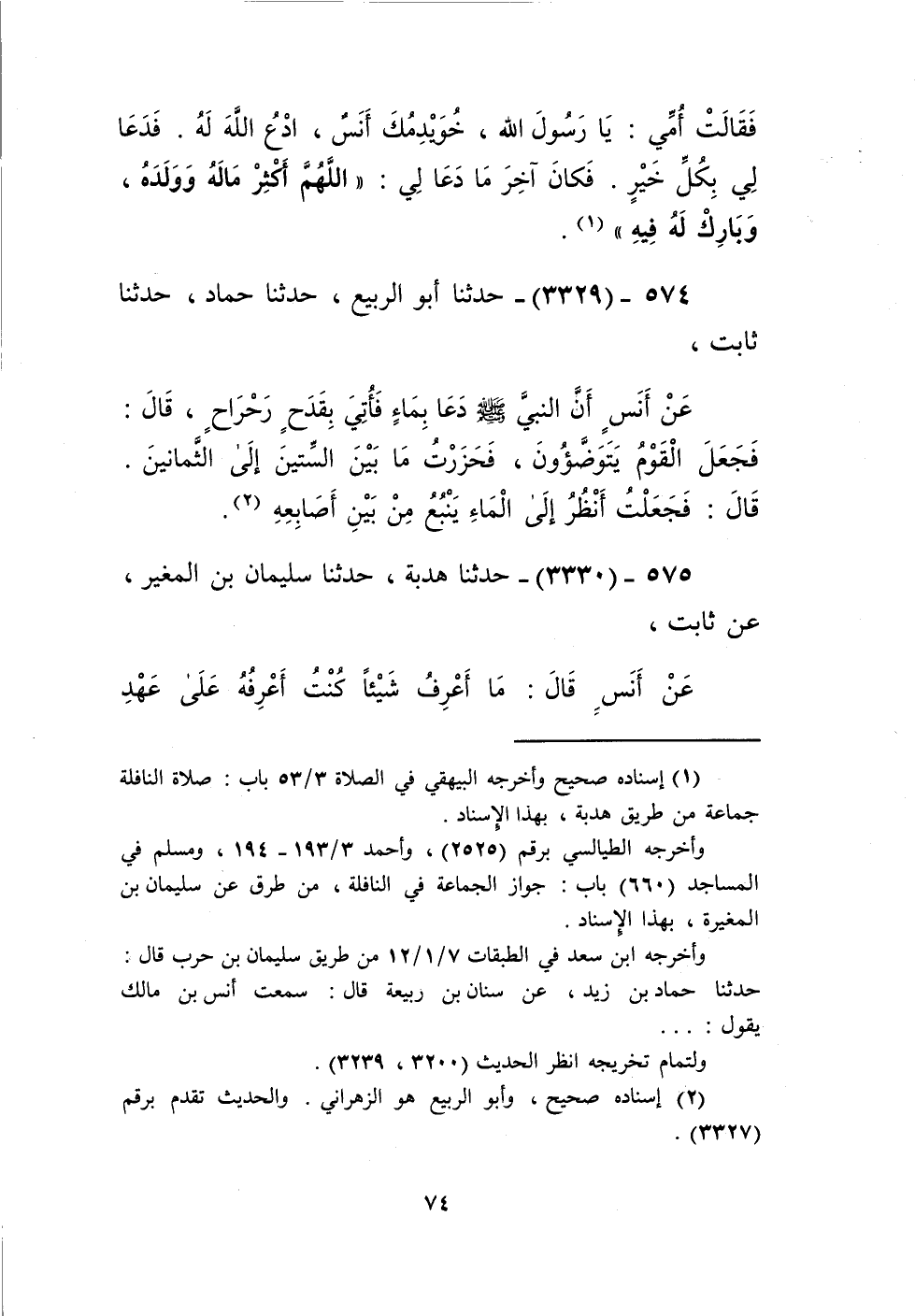 3329 - حَدَّثَنَا أَبُو الرَّبِيعِ، حَدَّثَنَا حَمَّادٌ، حَدَّثَنَا ثَابِتٌ، عَنْ أَنَسٍ، أَنَّ النَّبِيَّ صَلَّى اللهُ عَلَيْهِ وَسَلَّمَ «§دَعَا بِمَاءٍ فَأُتِيَ بِقَدَحٍ رَحْرَاحٍ» قَالَ: فَجَعَلَ الْقَوْمُ يَتَوَضَئُونَ، فَحَزَرْتُ مَا بَيْنَ السِّتِّينَ إِلَى الثَّمَانِينَ. قَالَ: «فَجَعَلْتُ أَنْظُرُ إِلَى الْمَاءِ يَنْبُعُ مِنْ بَيْنِ أَصَابِعِهِ» Kإسناده صحيح