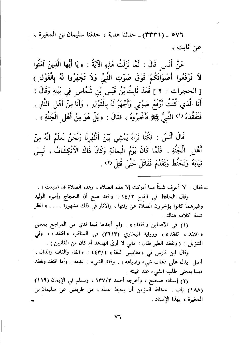 3331 - حَدَّثَنَا هُدْبَةُ، حَدَّثَنَا سُلَيْمَانُ بْنُ الْمُغِيرَةِ، عَنْ ثَابِتٍ، عَنْ أَنَسٍ، قَالَ: لَمَّا نَزَلَتْ هَذِهِ الْآيَةُ: {يَا أَيُّهَا الَّذِينَ آمَنُوا لَا تَرْفَعُوا أَصْوَاتَكُمْ فَوْقَ صَوْتِ النَّبِيِّ وَلَا تَجْهَرُوا لَهُ بِالْقَوْلِ} [الحجرات: 2] قَعَدَ ثَابِتُ بْنُ قَيْسِ بْنِ شَمَّاسٍ فِي بَيْتِهِ وَقَالَ: أَنَا الَّذِي كُنْتُ أَرْفَعُ صَوْتِي وَأَجْهَرُ لَهُ بِالْقَوْلِ، وَأَنَا مِنْ أَهْلِ النَّارِ. فَتَفَقَّدَهُ النَّبِيُّ صَلَّى اللهُ عَلَيْهِ وَسَلَّمَ فَأَخْبَرُوهُ، فَقَالَ: «§بَلْ هُوَ مِنْ أَهْلِ الْجَنَّةِ». قَالَ أَنَسٌ: فَكُنَّا نَرَاهُ يَمْشِي بَيْنَ أَظْهُرِنَا وَنَحْنُ نَعْلَمُ أَنَّهُ مِنْ أَهْلِ الْجَنَّةِ، فَلَمَّا كَانَ يَوْمُ الْيَمَامَةِ وَكَانَ ذَاكَ الِانْكِشَافُ، لَبِسَ ثِيَابَهُ وَتَحَنَّطَ وَتَقَدَّمَ فَقَاتَلَ حَتَّى قُتِلَKإسناده صحيح