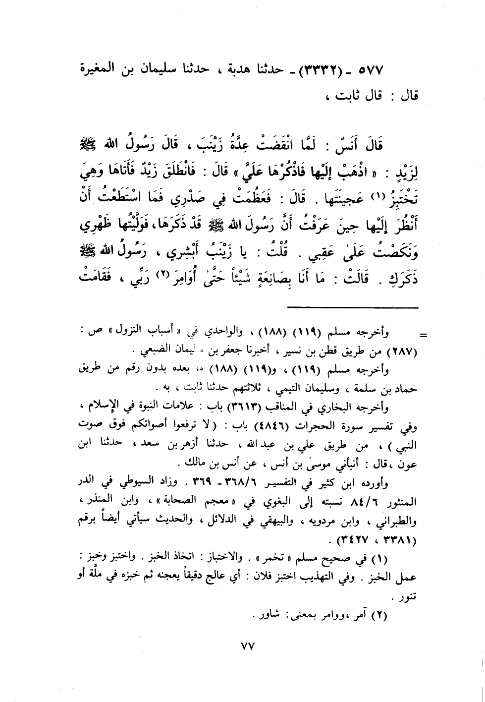 3332 - حَدَّثَنَا هُدْبَةُ، حَدَّثَنَا سُلَيْمَانُ بْنُ الْمُغِيرَةِ، قَالَ: قَالَ ثَابِتٌ: قَالَ أَنَسٌ: لَمَّا انْقَضَتْ عِدَّةُ زَيْنَبَ، قَالَ رَسُولُ اللَّهِ صَلَّى اللهُ عَلَيْهِ وَسَلَّمَ لِزَيْدٍ: «§اذْهَبْ إِلَيْهَا فَاذْكُرْهَا عَلَيَّ» قَالَ: فَانْطَلَقَ زَيْدٌ فَأَتَاهَا وَهِيَ تَخْتَبِزُ عَجِينَتَهَا، قَالَ: فَعَظُمَتْ فِي صَدْرِي، فَمَا اسْتَطَعْتُ أَنْ أَنْظُرَ إِلَيْهَا حِينَ عَرَفْتُ أَنَّ رَسُولَ اللَّهِ صَلَّى اللهُ عَلَيْهِ وَسَلَّمَ قَدْ ذَكَرَهَا، فَوَلَّيْتُهَا ظَهْرِي وَنَكَصَتُ عَلَى عَقِبِي، قُلْتُ: يَا زَيْنَبُ أَبْشِرِي، رَسُولُ اللَّهِ صَلَّى اللهُ عَلَيْهِ وَسَلَّمَ ذَكَرَكَ، قَالَتْ: مَا أَنَا بِصَانِعَةٍ شَيْئًا حَتَّى أُوَامِرَ رَبِّي، فَقَامَتْ إِلَى مَسْجِدِهَا وَنَزَلَ الْقُرْآنُ فَدَخَلَ عَلَيْهَا رَسُولُ اللَّهِ صَلَّى اللهُ عَلَيْهِ وَسَلَّمَ بِغَيْرِ إِذْنٍ -[78]-، قَالَ أَنَسٌ: فَلَقَدْ رَأَيْتُ رَسُولَ اللَّهِ صَلَّى اللهُ عَلَيْهِ وَسَلَّمَ أَطْعَمَنَا عَلَيْهَا الْخُبْزَ وَاللَّحْمَ حَتَّى امْتَدَّ النَّهَارُ، قَالَ: فَخَرَجَ النَّاسُ وَبَقِيَ رَهْطٌ فِي الْبَيْتِ يَتَحَدَّثُونَ قَدْ أَنِسَ بِهِمُ الْحَدِيثُ، فَخَرَجَ رَسُولُ اللَّهِ صَلَّى اللهُ عَلَيْهِ وَسَلَّمَ فَاتَّبَعْتُهُ، فَجَعَلَ يَتَتَبَّعُ حُجَرَ نِسَائِهِ يُسَلِّمُ عَلَيْهِنَّ، وَجَعَلْنَ يَقُلْنَ: كَيْفَ وَجَدْتَ أَهْلَكَ يَا رَسُولَ اللَّهِ؟ فَلَا أَدْرِي أَنَا أَخْبَرْتُهُ أَنَّ الْقَوْمَ قَدْ خَرَجُوا، أَوْ أُخْبِرَ، فَانْطَلَقَ رَسُولُ اللَّهِ صَلَّى اللهُ عَلَيْهِ وَسَلَّمَ حَتَّى دَخَلَ الْبَيْتَ، فَذَهَبْتُ أَدْخُلُ مَعَهُ فَأَلْقَى السِّتْرَ بَيْنِي وَبَيْنَهُ، وَنَزَلَتْ آيَةُ الْحِجَابِ وَوُعِظَ الْقَوْمُ بِمَا وُعِظُوا بِهِKإسناده صحيح