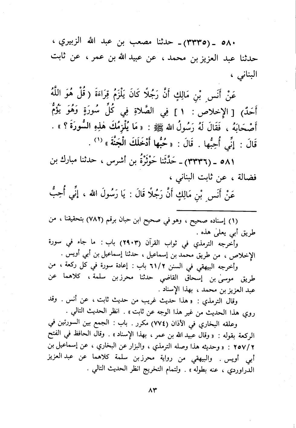 3335 - حَدَّثَنَا مُصْعَبُ بْنُ عَبْدِ اللَّهِ الزُّبَيْرِيُّ، حَدَّثَنَا عَبْدُ الْعَزِيزِ بْنُ مُحَمَّدٍ، عَنْ عُبَيْدِ اللَّهِ بْنِ عُمَرَ، عَنْ ثَابِتٍ الْبُنَانِيُّ، عَنْ أَنَسِ بْنِ مَالِكٍ، أَنَّ رَجُلًا كَانَ يَلْزَمُ قِرَاءَةَ قُلْ هُوَ اللَّهُ أَحَدٌ فِي الصَّلَاةِ فِي كُلِّ سُورَةٍ وَهُوَ يَؤُمُّ أَصْحَابَهُ، فَقَالَ لَهُ رَسُولُ اللَّهِ صَلَّى اللهُ عَلَيْهِ وَسَلَّمَ: «§مَا يُلْزِمُكَ هَذِهِ السُّورَةَ؟» قَالَ: إِنِّي أُحِبُّهَا. قَالَ: «حُبُّهَا أَدْخَلَكَ الْجَنَّةَ» Kإسناده صحيح