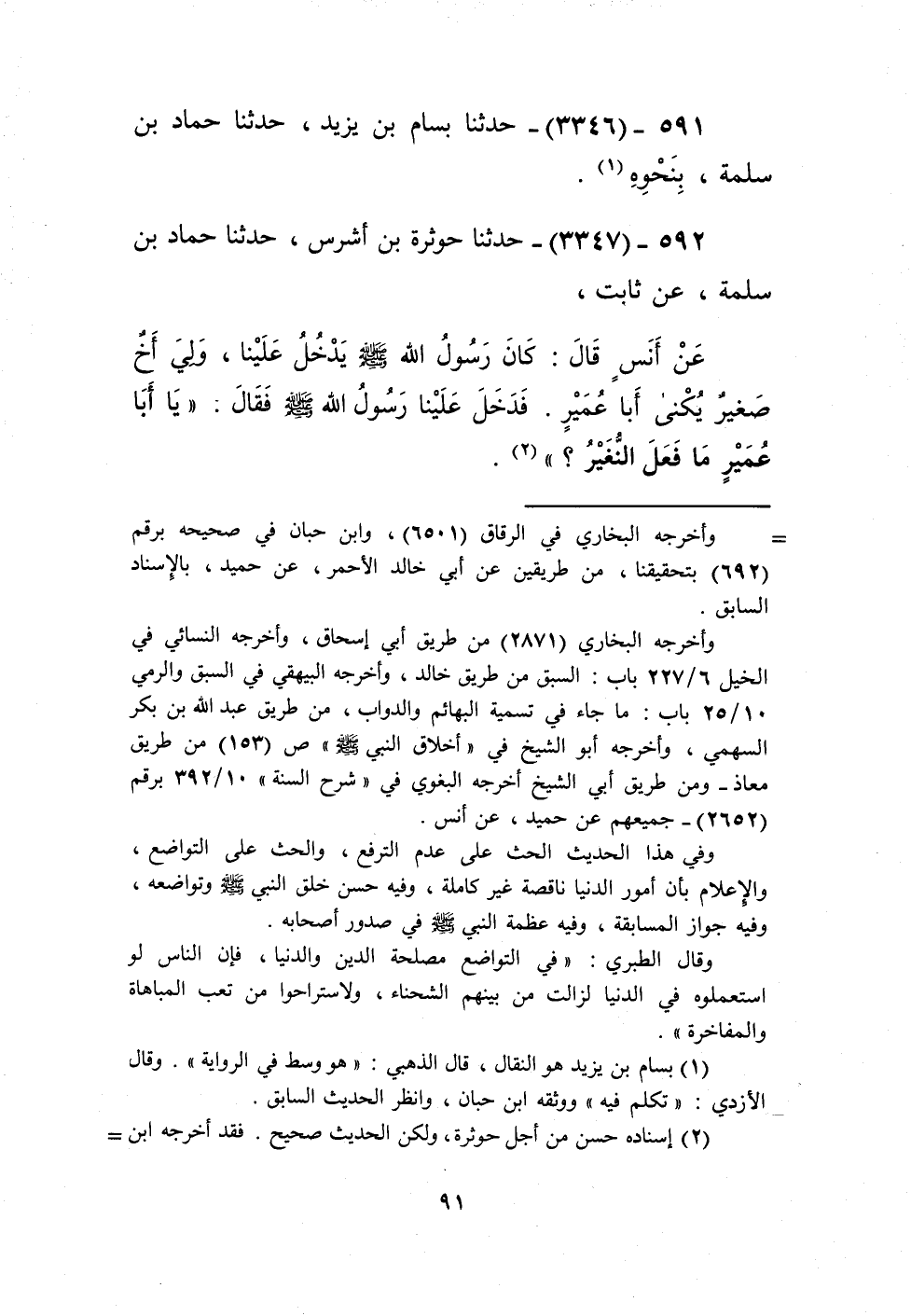 3347 - حَدَّثَنَا حَوْثَرَةُ بْنُ أَشْرَسَ، حَدَّثَنَا حَمَّادُ بْنُ سَلَمَةَ، عَنْ ثَابِتٍ، عَنْ أَنَسٍ، قَالَ: كَانَ رَسُولُ اللَّهِ صَلَّى اللهُ عَلَيْهِ وَسَلَّمَ يَدْخُلُ عَلَيْنَا، وَلِي أَخٌ صَغِيرٌ يُكْنَى أَبَا عُمَيْرٍ، فَدَخَلَ عَلَيْنَا رَسُولُ اللَّهِ صَلَّى اللهُ عَلَيْهِ وَسَلَّمَ فَقَالَ: «§يَا أَبَا عُمَيْرٍ، مَا فَعَلَ النُّغَيْرُ؟» Kإسناده حسن ولكن الحديث صحيح