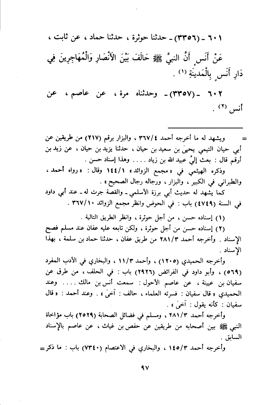 3356 - حَدَّثَنَا حَوْثَرَةُ، حَدَّثَنَا حَمَّادٌ، عَنْ ثَابِتٍ، عَنْ أَنَسٍ، أَنَّ النَّبِيَّ صَلَّى اللهُ عَلَيْهِ وَسَلَّمَ «§حَالَفَ بَيْنَ الْأَنْصَارِ وَالْمُهَاجِرِينَ فِي دَارِ أَنَسٍ بِالْمَدِينَةِ» Kإسناده حسن