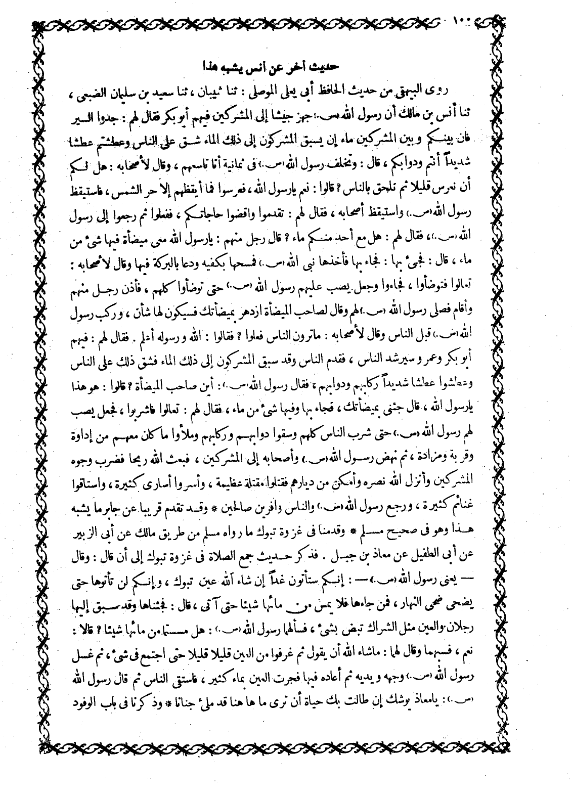 رَوَى الْبَيْهَقِيُّ مِنْ حَدِيثِ الْحَافِظِ أَبِي يَعْلَى الْمَوْصِلِيِّ: ثَنَا شَيْبَانُ، ثَنَا سَعِيدُ بْنُ سُلَيْمَانَ الضُّبَعِيُّ، ثَنَا أَنَسِ بْنِ مَالِكٍ أَنَّ رَسُولَ اللَّهِ صَلَّى اللَّهُ عَلَيْهِ وَسَلَّمَ جَهَّزَ جَيْشًا إِلَى المشركين فيهم أبو بكر فقال لهم: جدوا السَّيْرَ فَإِنَّ بَيْنَكُمْ وَبَيْنَ الْمُشْرِكِينَ مَاءً إِنْ يَسْبِقِ الْمُشْرِكُونَ إِلَى ذَلِكَ الْمَاءِ شَقَّ عَلَى النَّاسِ وَعَطِشْتُمْ عَطَشًا شَدِيدًا أَنْتُمْ وَدَوَابُّكُمْ، قَالَ: وَتَخَلَّفَ رَسُولُ اللَّهِ صَلَّى اللَّهُ عَلَيْهِ وَسَلَّمَ فِي ثَمَانِيَةٍ أَنَا تَاسِعُهُمْ، وَقَالَ لِأَصْحَابِهِ: هَلْ لَكَمَ أَنْ نُعَرِّسَ قَلِيلًا ثُمَّ نَلْحَقَ بِالنَّاسِ؟ قَالُوا: نَعَمْ يَا رَسُولَ اللَّهِ، فَعَرَّسُوا فَمَا أَيْقَظَهُمْ إِلَّا حَرُّ الشَّمْسِ، فَاسْتَيْقَظَ رَسُولُ اللَّهِ صَلَّى اللَّهُ عَلَيْهِ وَسَلَّمَ وَاسْتَيْقَظَ أَصْحَابُهُ، فَقَالَ لَهُمْ: تَقَدَّمُوا وَاقْضُوا حَاجَاتِكُمْ، فَفَعَلُوا ثُمَّ رَجَعُوا إِلَى رَسُولِ اللَّهِ صَلَّى اللَّهُ عَلَيْهِ وَسَلَّمَ، فَقَالَ لَهُمْ: هَلْ مَعَ أَحَدٍ مِنْكُمْ مَاءٌ؟ قَالَ رَجُلٌ مِنْهُمْ: يَا رَسُولَ اللَّهِ مَعِي مِيضَأَةٌ فِيهَا شَيْءٌ مِنْ مَاءٍ، قَالَ: فَجِئْ بها: فجاء بها فأخذها نبي اللَّهِ صَلَّى اللَّهُ عَلَيْهِ وَسَلَّمَ فَمَسَحَهَا بِكَفَّيْهِ ودعا بالبركة فيها وقال لأصحابه: