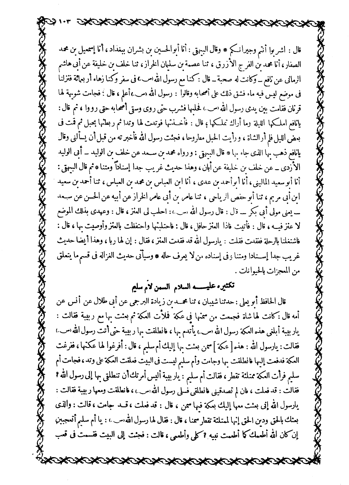 فاشتغلنا بالرحلة ففقدت فَقُلْتُ: يَا رَسُولَ اللَّهِ قَدْ فَقَدْتُ الْعَنْزَ، فَقَالَ: إِنَّ لَهَا رَبًّا، وَهَذَا أَيْضًا حَدِيثٌ غَرِيبٌ جِدًّا إِسْنَادًا وَمَتْنًا وَفِي إِسْنَادِهِ مَنْ لَا يُعْرَفُ حَالُهُ وَسَيَأْتِي حَدِيثُ الْغَزَالَةِ فِي قِسْمٍ مَا يَتَعَلَّقُ مِنَ الْمُعْجِزَاتِ بِالْحَيَوَانَاتِ.