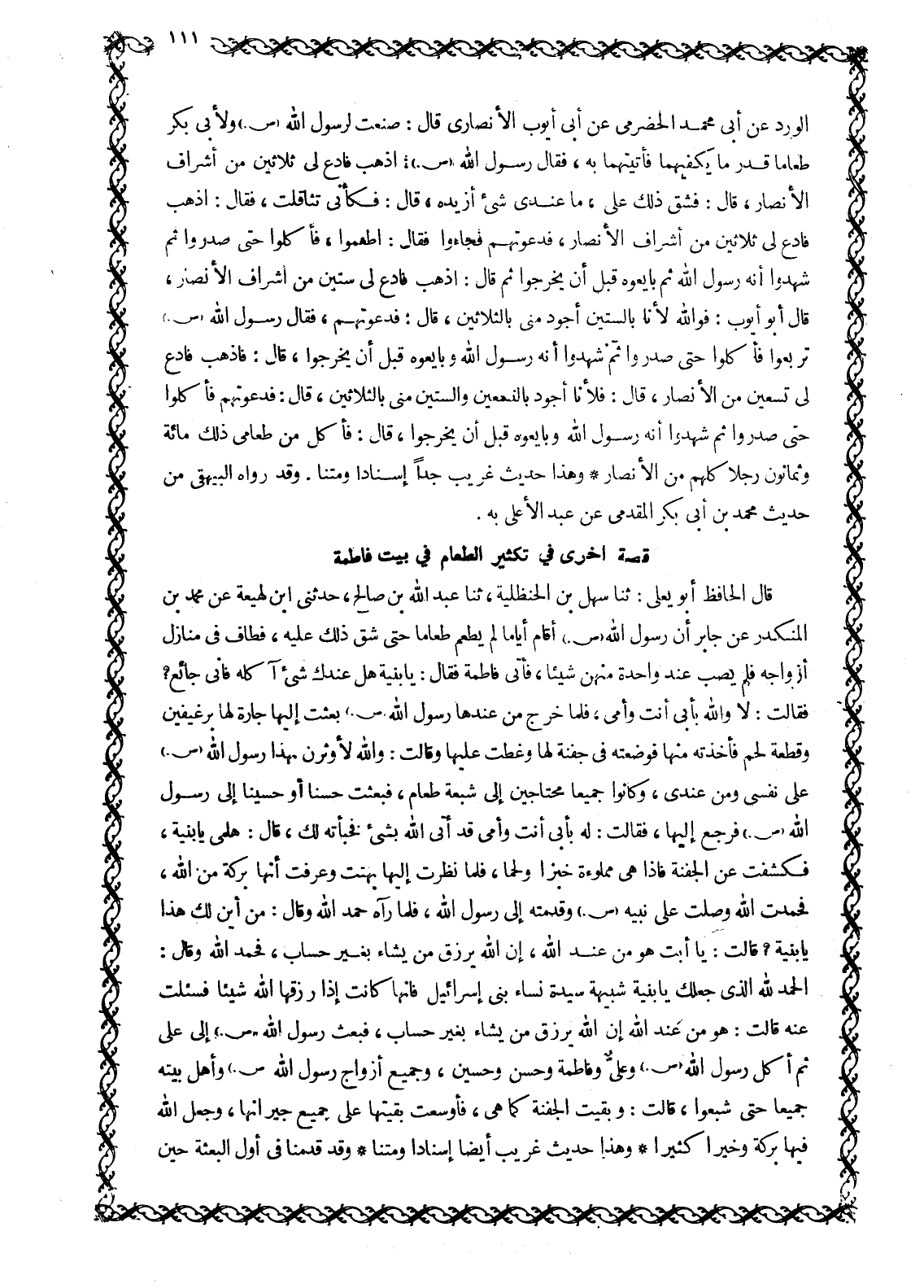 الْوَرْدِ عَنْ أَبِي مُحَمَّدٍ الْحَضْرَمِيِّ عَنْ أَبِي أَيُّوبَ الْأَنْصَارِيِّ قَالَ: صَنَعْتُ لِرَسُولِ اللَّهِ صَلَّى اللَّهُ عَلَيْهِ وَسَلَّمَ وَلِأَبِي بَكْرٍ طَعَامًا قَدْرَ مَا يَكْفِيهِمَا فَأَتَيْتُهُمَا بِهِ، فَقَالَ رَسُولُ اللَّهِ صَلَّى اللَّهُ عَلَيْهِ وَسَلَّمَ: اذْهَبْ فَادْعُ لِي ثَلَاثِينَ مِنْ أَشْرَافِ الْأَنْصَارِ، قَالَ: فَشَقَّ ذَلِكَ عَلَيَّ، مَا عِنْدِي شَيْءٌ أَزِيدُهُ، قَالَ: فَكَأَنِّي تَثَاقَلْتُ، فَقَالَ: اذْهَبْ فَادْعُ لِي ثَلَاثِينَ مِنْ أَشْرَافِ الْأَنْصَارِ، فَدَعَوْتُهُمْ فَجَاءُوا فَقَالَ: اطْعَمُوا، فَأَكَلُوا حَتَّى صَدَرُوا ثُمَّ شَهِدُوا أَنَّهُ رَسُولُ اللَّهِ ثُمَّ بَايَعُوهُ قَبْلَ أَنْ يَخْرُجُوا ثُمَّ قَالَ: اذْهَبْ فَادْعُ لِي سِتِّينَ مِنْ أَشْرَافِ الْأَنْصَارِ، قال أبو أيوب: فو الله لَأَنَا بِالسِّتِّينَ أَجْوَدُ مِنِّي بِالثَّلَاثِينَ، قَالَ: فَدَعَوْتُهُمْ، فَقَالَ رَسُولُ اللَّهِ صَلَّى اللَّهُ عَلَيْهِ وَسَلَّمَ تَرَبَّعُوا فَأَكَلُوا حَتَّى صَدَرُوا ثُمَّ شَهِدُوا أَنَّهُ رسول الله وَبَايَعُوهُ قَبْلَ أَنْ يَخْرُجُوا، قَالَ: فَاذْهَبْ فَادْعُ لِي تِسْعِينَ مِنَ الْأَنْصَارِ، قَالَ: فَلَأَنَا أَجُودُ بِالتِّسْعِينَ وَالسِّتِّينَ مِنِّي بِالثَّلَاثِينَ، قَالَ: فَدَعَوْتُهُمْ فَأَكَلُوا حَتَّى صَدَرُوا ثُمَّ شَهِدُوا أَنَّهُ رَسُولُ اللَّهِ وَبَايَعُوهُ قَبْلَ أَنْ يَخْرُجُوا، قَالَ: فَأَكَلَ مِنْ طَعَامِي ذَلِكَ مِائَةٌ وَثَمَانُونَ رَجُلًا كُلُّهُمْ مِنَ الْأَنْصَارِ وَهَذَا حَدِيثٌ غَرِيبٌ جِدًّا إِسْنَادًا وَمَتْنًا. وَقَدْ رَوَاهُ الْبَيْهَقِيُّ مِنْ حَدِيثِ مُحَمَّدِ بْنِ أَبِي بَكْرٍ الْمُقَدَّمِيِّ عَنْ عَبْدِ الْأَعْلَى بِهِ.
