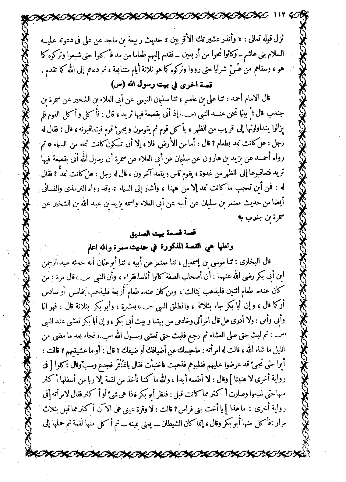 قَالَ الْبُخَارِيُّ: ثَنَا مُوسَى بْنُ إِسْمَاعِيلَ، ثَنَا مُعْتَمِرٌ عَنْ أَبِيهِ، ثَنَا أَبُو عُثْمَانَ أنه حدثه عبد الرحمن ابن أَبِي بَكْرٍ رَضِيَ اللَّهُ عَنْهُمَا: أَنَّ أَصْحَابَ الصُّفَّةِ كَانُوا أُنَاسًا فُقَرَاءَ، وَأَنَّ النَّبِيَّ صَلَّى اللَّهُ عَلَيْهِ وَسَلَّمَ قَالَ مَرَّةً: مَنْ كَانَ عِنْدَهُ طَعَامُ اثْنَيْنِ فَلْيَذْهَبْ بِثَالِثٍ، وَمَنْ كَانَ عِنْدَهُ طَعَامُ أَرْبَعَةٍ فَلْيَذْهَبْ بِخَامِسٍ أَوْ سَادِسٍ أَوْ كَمَا قَالَ، وَأَنَّ أَبَا بَكْرٍ جَاءَ بِثَلَاثَةٍ، وَانْطَلَقَ النَّبِيُّ صَلَّى اللَّهُ عَلَيْهِ وَسَلَّمَ بِعَشَرَةٍ، وَأَبُو بَكْرٍ بِثَلَاثَةٍ قَالَ: فَهُوَ أَنَا وَأَبِي وَأُمِّي: وَلَا أَدْرِي هَلْ قَالَ امْرَأَتِي وخادمي من بَيْتِنَا وَبَيْتِ أَبِي بَكْرٍ، وَأَنَّ أَبَا بَكْرٍ تَعَشَّى عِنْدَ النَّبِيِّ صَلَّى اللَّهُ عَلَيْهِ وَسَلَّمَ ثُمَّ لَبِثَ حَتَّى صَلَّى الْعِشَاءَ ثُمَّ رَجَعَ فَلَبِثَ حَتَّى تَعَشَّى رَسُولِ اللَّهِ صَلَّى اللَّهُ عَلَيْهِ وَسَلَّمَ فَجَاءَ بَعْدَ مَا مَضَى مِنَ اللَّيْلِ مَا شَاءَ اللَّهُ، قَالَتْ لَهُ امْرَأَتُهُ: مَا حَبَسَكَ عَنْ أَضْيَافِكَ أَوْ ضَيْفِكَ؟ قَالَ: أَوَ مَا عَشَّيْتِيهِمْ؟ قَالَتْ: