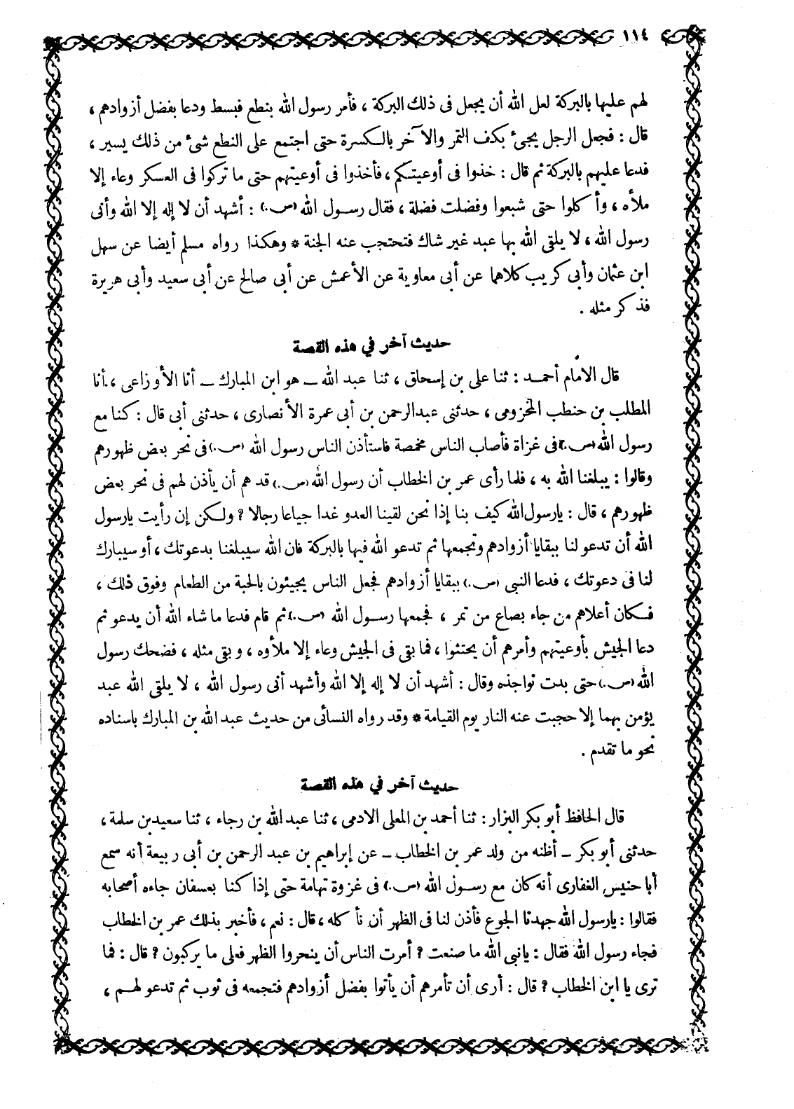 قَالَ الْإِمَامُ أَحْمَدُ: ثَنَا عَلِيُّ بْنُ إِسْحَاقَ، ثَنَا عَبْدُ اللَّهِ- هُوَ ابْنُ الْمُبَارَكِ- أَنَا الْأَوْزَاعِيُّ، أَنَا الْمُطَّلِبُ بْنُ حَنْطَبٍ الْمَخْزُومِيُّ، حَدَّثَنِي عَبْدُ الرَّحْمَنِ بْنُ أَبِي عَمْرَةَ الْأَنْصَارِيُّ، حَدَّثَنِي أَبِي قَالَ: كُنَّا مَعَ رَسُولِ اللَّهِ صَلَّى اللَّهُ عَلَيْهِ وَسَلَّمَ فِي غَزَاةٍ فَأَصَابَ النَّاسَ مَخْمَصَةٌ فَاسْتَأْذَنَ النَّاسُ رَسُولَ اللَّهِ صَلَّى اللَّهُ عَلَيْهِ وَسَلَّمَ فِي نَحْرِ بَعْضِ ظُهُورِهِمْ وَقَالُوا: يُبَلِّغُنَا اللَّهُ بِهِ، فَلَمَّا رَأَى عُمَرُ بْنُ الْخَطَّابِ أَنَّ رَسُولَ اللَّهِ صَلَّى اللَّهُ عَلَيْهِ وَسَلَّمَ قَدْ هَمَّ أَنْ يَأْذَنَ لَهُمْ في بحر بَعْضِ ظُهُورِهِمْ، قَالَ: يَا رَسُولَ اللَّهِ كَيْفَ بِنَا إِذَا نَحْنُ لَقِينَا الْعَدُوَّ غَدًا جِيَاعًا رِجَالًا؟ وَلَكِنْ إِنْ رَأَيْتَ يَا رَسُولَ اللَّهِ أَنْ تَدْعُوَ لَنَا بِبَقَايَا أَزْوَادِهِمْ وَتَجْمَعَهَا ثُمَّ تَدْعُوَ اللَّهَ فِيهَا بِالْبَرَكَةِ فَإِنَّ اللَّهَ سَيُبَلِّغُنَا بدعوتك، أو سَيُبَارِكُ لَنَا فِي دَعْوَتِكَ، فَدَعَا النَّبِيُّ صَلَّى اللَّهُ عَلَيْهِ وَسَلَّمَ بِبَقَايَا أَزْوَادِهِمْ فَجَعَلَ النَّاسُ يجيئون بالحبة مِنَ الطَّعَامِ وَفَوْقَ ذَلِكَ، فَكَانَ أَعْلَاهُمْ مَنْ جَاءَ بِصَاعٍ مَنْ تَمْرٍ، فَجَمَعَهَا رَسُولُ اللَّهِ صَلَّى اللَّهُ عَلَيْهِ وَسَلَّمَ ثُمَّ قَامَ فَدَعَا مَا شَاءَ اللَّهُ أَنْ يَدْعُوَ ثُمَّ دَعَا الجيش بأوعيتهم وأمرهم أن يحتثوا، فَمَا بَقِيَ فِي الْجَيْشِ وِعَاءٌ إِلَّا مَلَئُوهُ، وَبَقِيَ مِثْلُهُ، فَضَحِكَ رَسُولُ اللَّهِ صَلَّى اللَّهُ عَلَيْهِ وَسَلَّمَ حَتَّى بَدَتْ نَوَاجِذُهُ وَقَالَ: أَشْهَدُ أَنْ لَا إِلَهَ إِلَّا اللَّهُ وَأَشْهَدُ أَنِّي رسول الله، لا يلقى الله عبد يؤمن بِهِمَا إِلَّا حُجِبَتْ عَنْهُ النَّارُ يَوْمَ الْقِيَامَةِ وَقَدْ رَوَاهُ النَّسَائِيُّ مِنْ حَدِيثِ عَبْدِ اللَّهِ بْنِ الْمُبَارَكِ بِإِسْنَادِهِ نَحْوَ مَا تَقَدَّمَ.