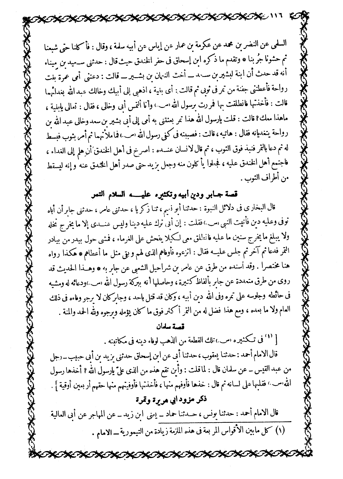السُّلَمِيِّ عَنِ النَّضْرِ بْنِ مُحَمَّدٍ عَنْ عِكْرِمَةَ بْنِ عَمَّارٍ عَنْ إِيَاسٍ عَنْ أَبِيهِ سَلَمَةَ، وَقَالَ: فَأَكَلْنَا حَتَّى شَبِعْنَا ثُمَّ حَشَوْنَا جُرُبَنَا وَتَقَدَّمَ مَا ذَكَرَهُ ابْنُ إِسْحَاقَ فِي حَفْرِ الْخَنْدَقِ حَيْثُ قَالَ: حَدَّثَنِي سَعِيدُ بْنُ مِينَاءَ أَنَّهُ قَدْ حُدِّثَ أَنَّ ابْنَةً لِبَشِيرِ بْنِ سَعْدٍ- أُخْتِ النُّعْمَانِ بْنِ بَشِيرٍ- قَالَتْ: دَعَتْنِي أُمِّي عَمْرَةُ بِنْتُ رَوَاحَةَ فأعطتنى جفنة مِنْ تَمْرٍ فِي ثَوْبِي ثُمَّ قَالَتْ: أَيْ بُنَيَّةُ، اذْهَبِي إِلَى أَبِيكِ وَخَالِكِ عَبْدِ اللَّهِ بِغَدَائِهِمَا قَالَتْ: فَأَخَذْتُهَا فَانْطَلَقْتُ بِهَا فَمَرَرْتُ بِرَسُولِ اللَّهِ صَلَّى اللَّهُ عَلَيْهِ وَسَلَّمَ وَأَنَا أَلْتَمِسُ أَبِي وَخَالِي، فَقَالَ: تَعَالَيْ يَا بُنَيَّةُ، مَا هَذَا مَعَكِ؟ قَالَتْ: قُلْتُ يَا رَسُولَ اللَّهِ هَذَا تَمْرٌ بَعَثَتْنِي بِهِ أُمِّي إِلَى أَبِي بَشِيرِ بْنِ سَعْدٍ وَخَالِي عَبْدِ اللَّهِ بْنِ رَوَاحَةَ يَتَغَدَّيَانِهِ فَقَالَ: هَاتِيهِ، قَالَتْ: فَصَبَبْتُهُ فِي كَفَّيْ رَسُولُ اللَّهِ صَلَّى اللَّهُ عَلَيْهِ وَسَلَّمَ فَمَا مَلَأَتْهُمَا ثُمَّ أَمَرَ بِثَوْبٍ فَبُسِطَ لَهُ ثم دعا بالتمر فنبذ فَوْقَ الثَّوْبِ، ثُمَّ قَالَ لِإِنْسَانٍ عِنْدَهُ: اصْرُخْ فِي أَهْلِ الْخَنْدَقِ أَنْ هَلُمَّ إِلَى الْغَدَاءِ، فَاجْتَمَعَ أَهْلُ الْخَنْدَقِ عَلَيْهِ، فَجَعَلُوا يَأْكُلُونَ مِنْهُ وَجَعَلَ يَزِيدُ حَتَّى صَدَرَ أَهْلُ الْخَنْدَقِ عَنْهُ وَإِنَّهُ لِيَسْقُطُ مِنْ أَطْرَافِ الثَّوْبِ.