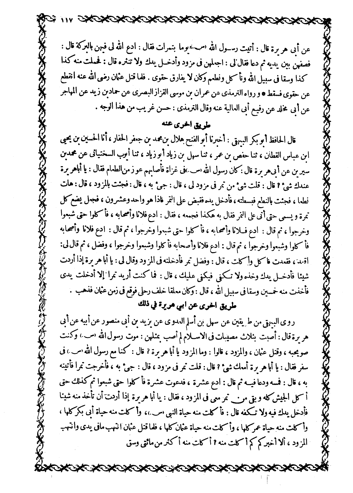 رَوَى الْبَيْهَقِيُّ مِنْ طَرِيقَيْنِ عَنْ سَهْلِ بْنِ أَسْلَمَ الْعَدَوِيِّ عَنْ يَزِيدَ بْنِ أَبِي مَنْصُورٍ عَنْ أَبِيهِ عَنْ أَبِي هُرَيْرَةَ قَالَ: أُصِبْتُ بِثَلَاثِ مُصِيبَاتٍ فِي الْإِسْلَامِ لَمْ أُصَبْ بِمِثْلِهِنَّ: مَوْتِ رَسُولِ اللَّهِ صَلَّى اللَّهُ عَلَيْهِ وَسَلَّمَ وَكُنْتُ صُوَيْحِبَهُ، وَقَتْلِ عُثْمَانَ، وَالْمِزْوَدِ، قَالُوا: وَمَا الْمِزْوَدُ يَا أَبَا هُرَيْرَةَ؟ قَالَ: كُنَّا مَعَ رَسُولِ اللَّهِ صَلَّى اللَّهُ عَلَيْهِ وَسَلَّمَ فِي سَفَرٍ فَقَالَ: يَا أَبَا هُرَيْرَةَ أَمَعَكَ شَيْءٌ؟ قَالَ: قُلْتُ تمر في مزود، قال: جيء بِهِ، فَأَخْرَجْتُ تَمْرًا فَأَتَيْتُهُ بِهِ، قَالَ: فَمَسَّهُ وَدَعَا فِيهِ ثُمَّ قَالَ: ادْعُ عَشَرَةً، فَدَعَوْتُ عَشَرَةً فَأَكَلُوا حَتَّى شَبِعُوا ثُمَّ كَذَلِكَ حَتَّى أَكَلَ الْجَيْشُ كُلُّهُ وَبَقِيَ مِنْ تَمْرٍ مَعِي فِي الْمِزْوَدِ، فَقَالَ: يَا أَبَا هُرَيْرَةَ إِذَا أَرَدْتَ أَنْ تَأْخُذَ مِنْهُ شَيْئًا فَأَدْخِلْ يَدَكَ فيه ولا تكفه قَالَ: فَأَكَلْتُ مِنْهُ حَيَاةَ النَّبِيِّ صَلَّى اللَّهُ عَلَيْهِ وَسَلَّمَ، وَأَكَلْتُ مِنْهُ حَيَاةَ أَبِي بَكْرٍ كُلَّهَا، وَأَكَلْتُ مِنْهُ حَيَاةَ عُمَرَ كُلَّهَا، وَأَكَلْتُ مِنْهُ حَيَاةَ عُثْمَانَ كُلَّهَا، فَلَمَّا قُتِلَ عُثْمَانُ انْتُهِبَ مَا فِي يَدِي وَانْتُهِبَ الْمِزْوَدُ، أَلَا أُخْبِرُكُمْ كَمْ أَكَلْتُ مِنْهُ؟ أَكَلْتُ مِنْهُ أَكْثَرَ مِنْ مِائَتَيْ وَسْقٍ