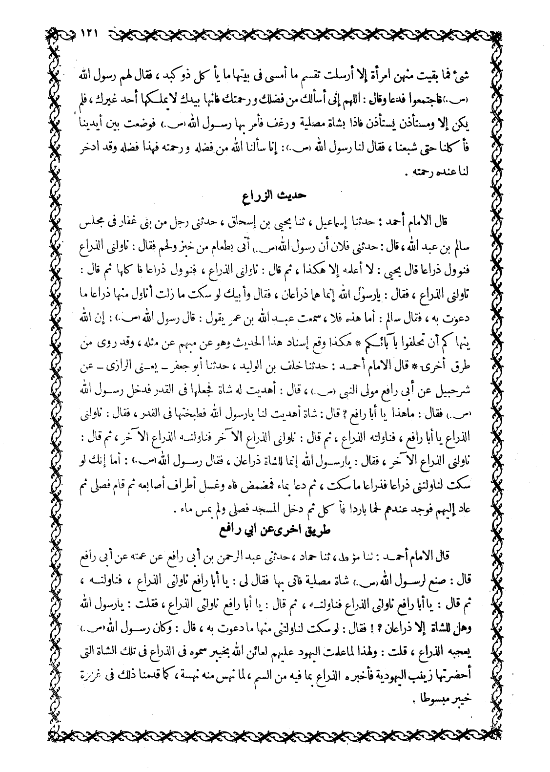 قَالَ الْإِمَامُ أَحْمَدُ: ثَنَا مُؤَمَّلٌ، ثَنَا حَمَّادٌ، حَدَّثَنِي عَبْدُ الرَّحْمَنِ بْنُ أَبِي رَافِعٍ عَنْ عَمَّتِهِ عَنْ أَبِي رَافِعٍ قَالَ: صُنِعَ لِرَسُولِ اللَّهِ صَلَّى اللَّهُ عَلَيْهِ وَسَلَّمَ شَاةٌ مَصْلِيَّةٌ فَأُتِيَ بِهَا فَقَالَ لِي: يَا أَبَا رَافِعٍ نَاوِلْنِي الذِّرَاعَ، فَنَاوَلْتُهُ، ثُمَّ قَالَ: يَا أَبَا رَافِعٍ نَاوِلْنِي الذِّرَاعَ فَنَاوَلْتُهُ، ثُمَّ قَالَ: يَا أَبَا رَافِعٍ نَاوِلْنِي الذِّرَاعَ، فَقُلْتُ: يَا رَسُولَ اللَّهِ وَهَلْ لِلشَّاةِ إِلَّا ذِرَاعَانِ؟! فَقَالَ: لَوْ سَكَتَّ لَنَاوَلْتَنِي مِنْهَا مَا دَعَوْتُ بِهِ، قَالَ: وَكَانَ رَسُولُ اللَّهِ صَلَّى اللَّهُ عَلَيْهِ وَسَلَّمَ يُعْجِبُهُ الذِّرَاعَ، قُلْتُ: وَلِهَذَا لَمَّا عَلِمَتِ الْيَهُودُ عَلَيْهِمْ لِعَائِنُ اللَّهِ بِخَيْبَرَ سَمُّوهُ فِي الذِّرَاعِ فِي تِلْكَ الشَّاةِ الَّتِي أَحْضَرَتْهَا زَيْنَبُ الْيَهُودِيَّةُ فَأَخْبَرَهُ الذِّرَاعُ بِمَا فِيهِ مِنَ السُّمِّ، لَمَّا نَهَسَ مِنْهُ نَهْسَةً، كَمَا قَدَّمْنَا ذَلِكَ فِي غَزْوَةِ خَيْبَرَ مَبْسُوطًا.