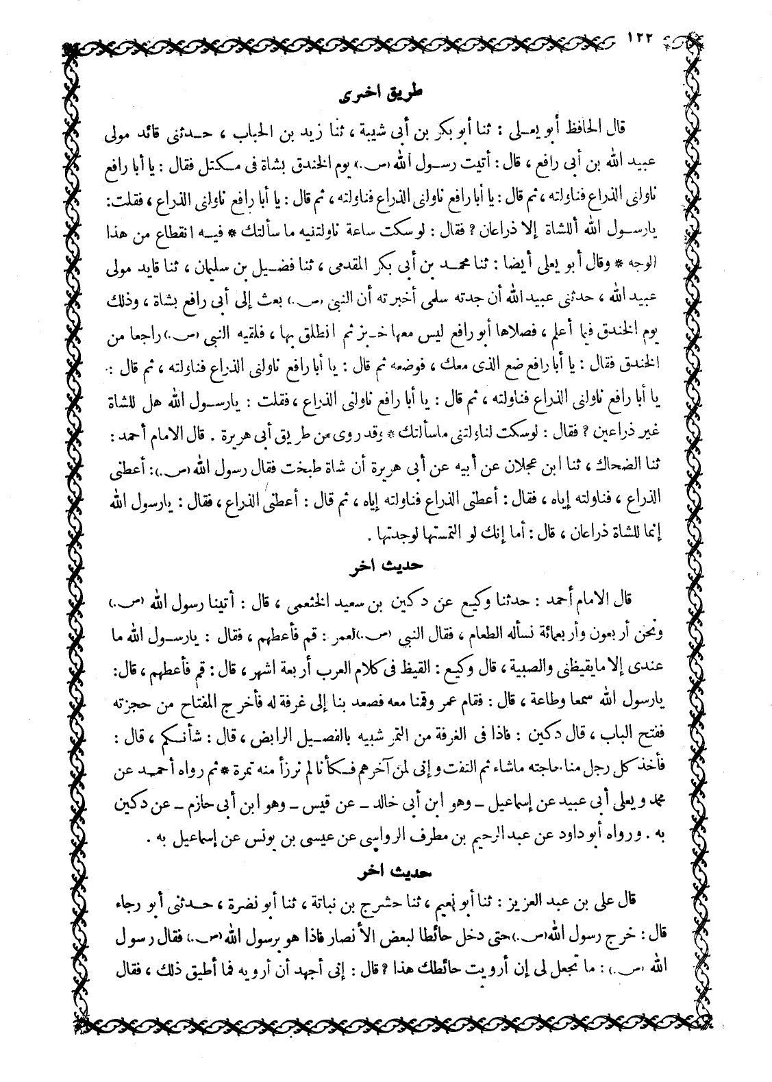 يَا أَبَا رَافِعٍ نَاوِلْنِي الذِّرَاعَ فَنَاوَلْتُهُ، ثُمَّ قَالَ: يَا أَبَا رَافِعٍ نَاوِلْنِي الذِّرَاعَ، فَقُلْتُ: يَا رَسُولَ اللَّهِ هَلْ لِلشَّاةِ غَيْرُ ذِرَاعَيْنِ؟ فَقَالَ: لَوْ سَكَتَّ لَنَاوَلْتَنِي مَا سَأَلْتُكَ وَقَدْ رُوِيَ مِنْ طَرِيقِ أَبِي هُرَيْرَةَ. قَالَ الْإِمَامُ أَحْمَدُ: