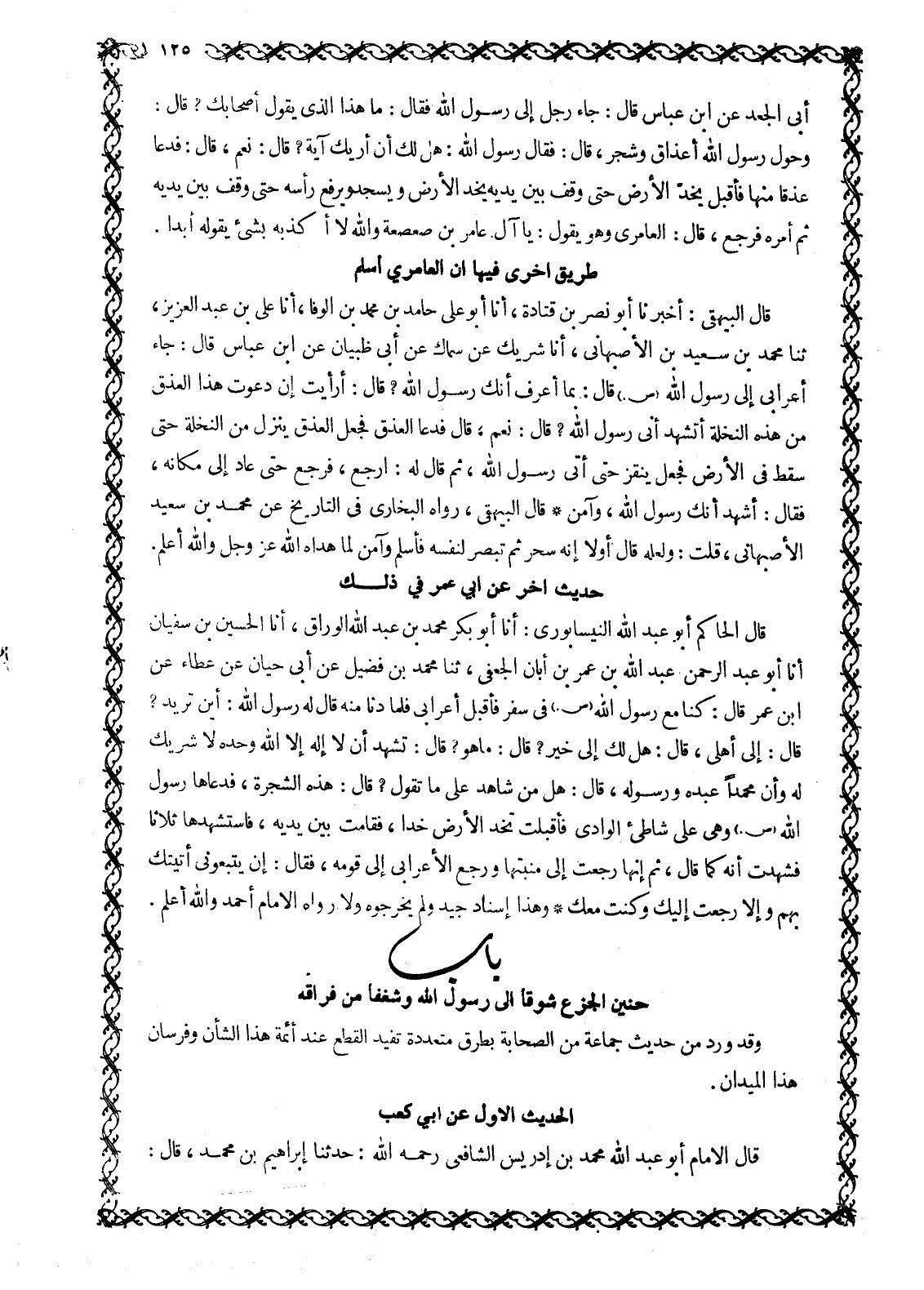 وحول رسول الله أعذاق وشجر، قال: فقال رسول الله: هَلْ لَكَ أَنْ أُرِيَكَ آيَةً؟ قَالَ: نَعَمْ، قَالَ: فَدَعَا عِذْقًا مِنْهَا فَأَقْبَلَ يَخُدُّ الْأَرْضَ حتى وقف بين يديه يَخُدُّ الْأَرْضَ وَيَسْجُدُ وَيَرْفَعُ رَأْسَهُ حَتَّى وَقَفَ بين يديه ثم أمره فرجع، قال: الْعَامِرِيُّ وَهُوَ يَقُولُ: يَا آلَ عَامِرِ بْنِ صَعْصَعَةَ وَاللَّهِ لَا أُكَذِّبُهُ بِشَيْءٍ يَقُولُهُ أَبَدًا.