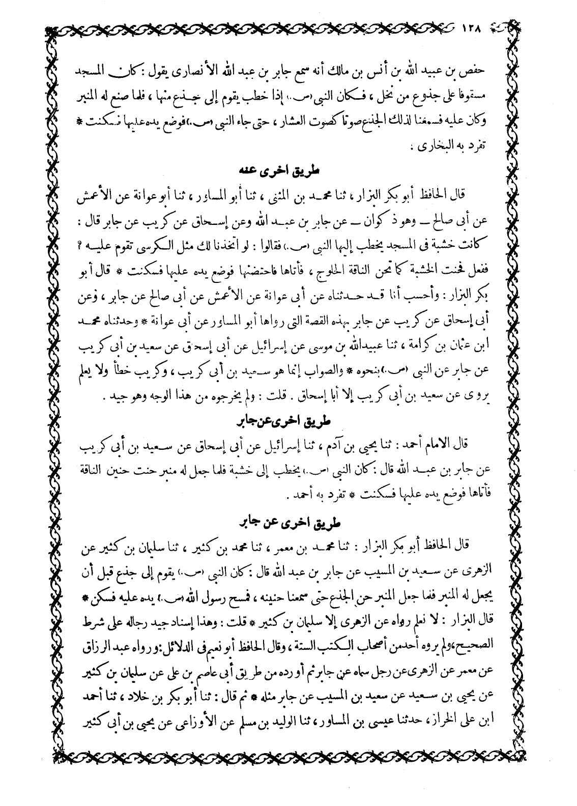 قَالَ الْحَافِظُ أَبُو بَكْرٍ الْبَزَّارُ: ثَنَا مُحَمَّدُ بْنُ مَعْمَرٍ، ثَنَا مُحَمَّدُ بْنُ كَثِيرٍ، ثَنَا سُلَيْمَانُ بْنُ كَثِيرٍ عَنِ الزُّهْرِيِّ عَنْ سَعِيدِ بْنِ الْمُسَيَّبِ عَنْ جَابِرِ بْنِ عَبْدِ اللَّهِ قَالَ: كَانَ النَّبِيُّ صَلَّى اللَّهُ عَلَيْهِ وَسَلَّمَ يَقُومُ إِلَى جِذْعٍ قَبْلَ أَنْ يُجْعَلَ لَهُ الْمِنْبَرُ فَلَمَّا جُعِلَ الْمِنْبَرُ حَنَّ الْجِذْعُ حَتَّى سَمِعْنَا حَنِينَهُ، فَمَسَحَ رَسُولُ اللَّهِ صَلَّى اللَّهُ عَلَيْهِ وَسَلَّمَ يَدَهُ عَلَيْهِ فَسَكَنَ قَالَ الْبَزَّارُ: لَا نَعْلَمُ رَوَاهُ عَنِ الْزُّهْرِيِّ إِلَّا سُلَيْمَانَ بْنَ كَثِيرٍ قُلْتُ: وَهَذَا إِسْنَادٌ جِيدٌ رِجَالُهُ عَلَى شَرْطِ الصَّحِيحِ، وَلَمْ يَرْوِهِ أَحَدٌ مِنْ أَصْحَابِ الْكُتُبِ السِّتَّةِ، وَقَالَ الْحَافِظُ أَبُو نُعَيْمٍ فِي الدَّلَائِلِ: وَرَوَاهُ عَبْدِ الرَّزَّاقِ عَنْ مَعْمَرٍ عَنِ الزُّهْرِيِّ عَنْ رَجُلٍ سَمَّاهُ عن جابر ثم أورده من طريق أبى عَاصِمِ بْنِ عَلِيٍّ عَنْ سُلَيْمَانَ بْنِ كَثِيرٍ عَنْ يَحْيَى بْنِ سَعِيدٍ عَنْ سَعِيدِ بْنِ الْمُسَيِّبِ عَنْ جَابِرٍ مِثْلَهُ ثُمَّ قَالَ: ثَنَا أبو بكر بن خلاد، ثنا أحمد ابن عَلِيٍّ الْخَرَّازُ، حَدَّثَنَا عِيسَى بْنُ الْمُسَاوِرِ، ثَنَا الْوَلِيدُ بْنُ مُسْلِمٍ عَنِ الْأَوْزَاعِيُّ عَنْ يَحْيَى بْنِ أَبِي كَثِيرٍ
