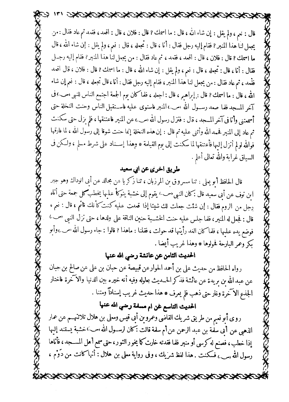 قال: نعم، ولم يقل: إن شاء الله، قَالَ: مَا اسْمُكَ؟ قَالَ: فَلَانٌ، قَالَ: اقْعُدْ، فَقَعَدَ ثُمَّ عَادَ فَقَالَ: مَنْ يَجْعَلُ لَنَا هَذَا الْمِنْبَرَ؟ فَقَامَ إِلَيْهِ رَجُلٌ فَقَالَ: أَنَا، قال: تجعله، قال: نعم، ولم يقل: إن شَاءَ اللَّهُ، قَالَ مَا اسْمُكَ؟ قَالَ: فَلَانٌ، قَالَ: اقْعُدْ، فَقَعَدَ، ثُمَّ عَادَ فَقَالَ: مَنْ يَجْعَلُ لَنَا هَذَا الْمِنْبَرَ؟ فَقَامَ إِلَيْهِ رَجُلٌ فَقَالَ: أَنَا، قَالَ: تَجْعَلُهُ، قَالَ: نَعَمْ، وَلَمْ يقل: إن شاء الله، قال: ما اسمك؟ قَالَ: فَلَانٌ، قَالَ اقْعُدْ فَقَعَدَ، ثُمَّ عَادَ فَقَالَ: مَنْ يَجْعَلُ لَنَا هَذَا الْمِنْبَرَ، فَقَامَ إليه رجل فقام: أَنَا، قَالَ تَجْعَلُهُ، قَالَ: نَعَمْ إِنْ شَاءَ اللَّهُ، قَالَ: مَا اسْمُكَ؟ قَالَ: إِبْرَاهِيمُ، قَالَ: اجْعَلْهُ، فَلَمَّا كَانَ يَوْمُ الْجُمُعَةِ اجْتَمَعَ النَّاسُ لِلنَّبِيِّ صَلَّى اللَّهُ عَلَيْهِ وَسَلَّمَ فِي آخِرِ الْمَسْجِدِ فَلَمَّا صَعِدَ رَسُولُ اللَّهِ صَلَّى اللَّهُ عَلَيْهِ وَسَلَّمَ الْمِنْبَرَ فاستوى عليه فاستقبل النَّاسَ وَحَنَّتِ النَّخْلَةُ حَتَّى أَسْمَعَتْنِي وَأَنَا فِي آخِرِ الْمَسْجِدِ، قَالَ: فَنَزَلَ رَسُولُ اللَّهِ صَلَّى اللَّهُ عَلَيْهِ وَسَلَّمَ عَنِ الْمِنْبَرِ فَاعْتَنَقَهَا، فَلَمْ يَزَلْ حَتَّى سَكَنَتْ ثُمَّ عَادَ إِلَى الْمِنْبَرَ فَحَمِدَ اللَّهَ وَأَثْنَى عَلَيْهِ ثُمَّ قَالَ: إِنَّ هَذِهِ النَّخْلَةَ إِنَّمَا حَنَّتْ شَوْقًا إِلَى رَسُولِ الله، لما فارقها فو الله لَوْ لَمْ أَنْزِلْ إِلَيْهَا فَأَعْتَنِقْهَا لَمَا سَكَنَتْ إلى يوم القيامة وهذا إسناد عَلَى شَرْطِ مُسْلِمٍ، وَلَكِنْ فِي السِّيَاقِ غَرَابَةٌ وَاللَّهُ تَعَالَى أَعْلَمُ.