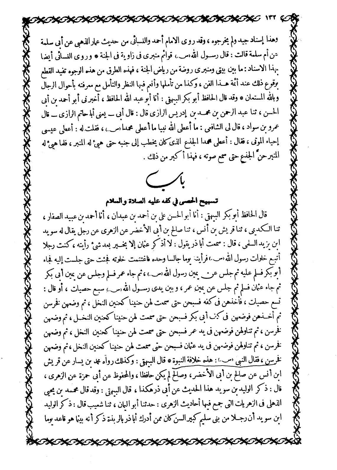 تِسْعُ حَصَيَاتٍ، فَأَخَذَهُنَّ فِي كَفِّهِ فَسَبَّحْنَ حتى سمعت لهن حنينا كحنين النخل، ثُمَّ وَضَعَهُنَّ فَخَرِسْنَ ثُمَّ أَخَذَهُنَّ فَوَضَعَهُنَّ فِي كف أَبِي بَكْرٍ فَسَبَّحْنَ حَتَّى سَمِعْتُ لَهُنَّ حَنِينًا كحنين النخل، ثُمَّ وَضَعَهُنَّ فَخَرِسْنَ، ثُمَّ تَنَاوَلَهُنَّ فَوَضَعَهُنَّ فِي يَدِ عُمَرَ فَسَبَّحْنَ حَتَّى سَمِعْتُ لَهُنَّ حَنِينًا كحنين النخل، ثُمَّ وَضَعَهُنَّ فَخَرِسْنَ، ثُمَّ تَنَاوَلَهُنَّ فَوَضَعَهُنَّ فِي يَدِ عُثْمَانَ فَسَبَّحْنَ حَتَّى سَمِعْتُ لَهُنَّ حَنِينًا كحنين النخل، ثُمَّ وَضَعَهُنَّ فَخَرِسْنَ، فَقَالَ النَّبِيُّ صَلَّى اللَّهُ عَلَيْهِ وَسَلَّمَ: هَذِهِ خِلَافَةُ النُّبُوَّةِ قَالَ الْبَيْهَقِيُّ: وكذلك رواه محمد بن يسار عن قريش ابن أَنَسٍ عَنْ صَالِحِ بْنِ أَبِي الْأَخْضَرِ، وَصَالِحٌ لم يكن حافظا، والمحفوظ عن أَبِي حَمْزَةَ عَنِ الْزُّهْرِيِّ، قَالَ: ذَكَرَ الْوَلِيدُ بن سويد هَذَا الْحَدِيثَ عَنْ أَبِي ذَرٍّ هَكَذَا، قَالَ الْبَيْهَقِيُّ: وَقَدْ قَالَ مُحَمَّدُ بْنُ يَحْيَى الذُّهْلِيُّ فِي الْزُّهْرِيَّاتِ الَّتِي جَمَعَ فِيهَا أَحَادِيثَ الْزُّهْرِيِّ: حدثنا أبو اليمان، ثنا شعيب قال: ذكر الوليد ابن سُوَيْدٍ أَنَّ رَجُلًا مِنْ بَنِي سُلَيْمٍ كَبِيرَ السِّنِّ كَانَ مِمَّنْ أَدْرَكَ أَبَا ذَرٍّ بِالرَّبَذَةِ ذَكَرَ أَنَّهُ بَيْنَمَا هُوَ قَاعِدٌ يَوْمًا