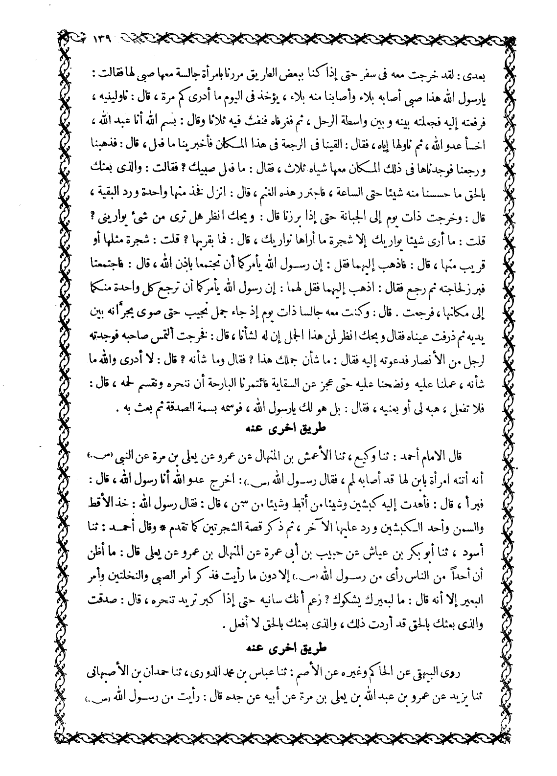 فَبَرَأَ، قَالَ: فَأَهْدَتْ إِلَيْهِ كَبْشَيْنِ وَشَيْئًا مِنْ أَقِطٍ وَشَيْئًا مِنْ سَمْنٍ، قَالَ: فَقَالَ رسول الله: خُذِ الْأَقِطَ وَالسَّمْنَ وَأَحَدَ الْكَبْشَيْنِ وَرُدَّ عَلَيْهَا الْآخَرَ، ثُمَّ ذَكَرَ قِصَّةَ الشَّجَرَتَيْنِ كَمَا تَقَدَّمَ وَقَالَ أَحْمَدُ: ثَنَا أَسْوَدُ، ثَنَا أَبُو بَكْرِ بْنُ عَيَّاشٍ عَنْ حَبِيبِ بْنِ أَبِي عَمْرَةَ عَنِ الْمِنْهَالِ بْنِ عَمْرٍو عَنْ يَعْلَى قَالَ: مَا أَظُنُّ أَنَّ أَحَدًا مِنَ النَّاسِ رَأَى مِنْ رَسُولِ اللَّهِ صَلَّى اللَّهُ عَلَيْهِ وَسَلَّمَ إِلَّا دُونَ مَا رَأَيْتُ فَذَكَرَ أَمْرَ الصَّبِيِّ وَالنَّخْلَتَيْنِ وَأَمْرَ الْبَعِيرِ إِلَّا أَنَّهُ قَالَ: مَا لبعيرك يشكوك؟ زعم أنك سانيه حتى إذا كبر تريد تَنْحَرَهُ، قَالَ: صَدَقْتَ وَالَّذِي بَعَثَكَ بِالْحَقِّ قَدْ أَرَدْتُ ذَلِكَ، وَالَّذِي بَعَثَكَ بِالْحَقِّ لَا أَفْعَلُ.