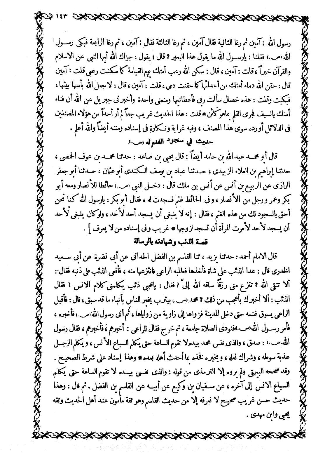 رسول الله: آمِينَ ثُمَّ رَغَا الثَّانِيَةَ فَقَالَ آمِينَ، ثُمَّ رَغَا الثَّالِثَةَ فَقَالَ: آمِينَ، ثُمَّ رَغَا الرَّابِعَةَ فَبَكَى رَسُولُ اللَّهِ صَلَّى اللَّهُ عَلَيْهِ وَسَلَّمَ فَقُلْنَا: يَا رَسُولَ اللَّهِ مَا يَقُولُ هَذَا الْبَعِيرُ؟ قَالَ: يَقُولُ: جَزَاكَ اللَّهُ أَيُّهَا النَّبِيُّ عَنِ الْإِسْلَامِ وَالْقُرْآنِ خَيْرًا، قُلْتُ: آمِينَ، قَالَ: سَكَّنَ اللَّهُ رُعْبَ أُمَّتِكَ يَوْمَ الْقِيَامَةِ كَمَا سَكَّنْتَ رُعْبِي قُلْتُ: آمِينَ قَالَ: حَقَنَ اللَّهُ دِمَاءَ أُمَّتِكَ مِنْ أَعْدَائِهَا كَمَا حَقَنْتَ دَمِي، قُلْتُ: آمِينَ، قَالَ: لَا جَعَلَ اللَّهُ بِأَسَهَا بينها، فبكيت وقلت: هذه خصال سَأَلْتُ رَبِّي فَأَعْطَانِيهَا وَمَنَعَنِي وَاحِدَةً وَأَخْبَرَنِي جِبْرِيلُ عَنِ اللَّهِ أَنَّ فَنَاءَ أُمَّتِكَ بِالسَّيْفِ فَجَرَى الْقَلَمُ بِمَا هُوَ كَائِنٌ قُلْتُ: هَذَا الْحَدِيثُ غَرِيبٌ جِدًّا لَمْ أَرَ أَحَدًا مِنْ هَؤُلَاءِ الْمُصَنِّفِينَ فِي الدَّلَائِلِ أَوْرَدَهُ سِوَى هَذَا الْمُصَنِّفِ، وَفِيهِ غَرَابَةٌ وَنَكَارَةٌ فِي إِسْنَادِهِ وَمَتْنِهِ أَيْضًا والله أعلم.
