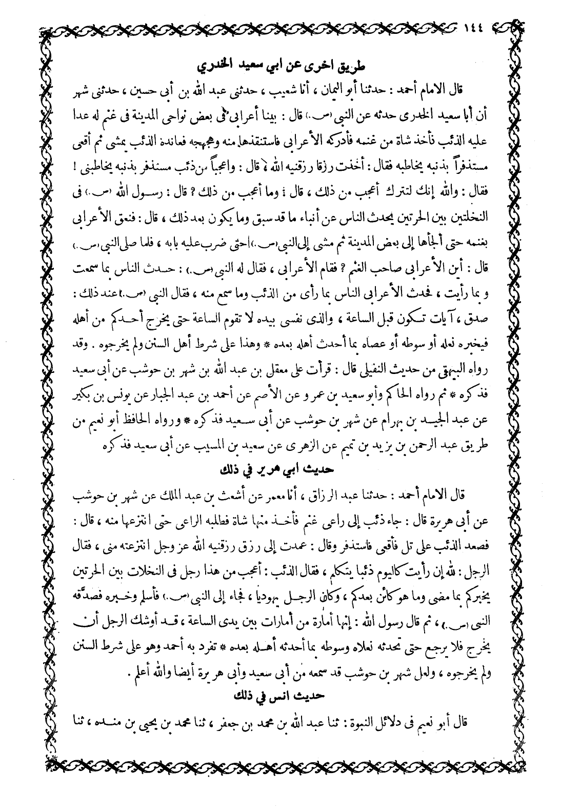 قَالَ الْإِمَامُ أَحْمَدُ: حَدَّثَنَا أَبُو الْيَمَانِ، أَنَا شُعَيْبٌ، حَدَّثَنِي عَبْدُ اللَّهِ بْنُ أَبِي حُسَيْنٍ، حَدَّثَنِي شَهْرٌ أَنَّ أَبَا سَعِيدٍ الْخُدْرِيَّ حَدَّثَهُ عَنِ النَّبِيِّ صَلَّى اللَّهُ عَلَيْهِ وَسَلَّمَ قَالَ: بَيْنَا أَعْرَابِيٌّ فِي بَعْضِ نَوَاحِي الْمَدِينَةِ فِي غَنَمٍ لَهُ عَدَا عَلَيْهِ الذِّئْبُ فَأَخَذَ شَاةً مِنْ غَنَمِهِ فَأَدْرَكَهُ الْأَعْرَابِيُّ فَاسْتَنْقَذَهَا مِنْهُ وَهَجْهَجَهُ فَعَانَدَهُ الذِّئْبُ يَمْشِي ثُمَّ أَقْعَى مُسْتَذْفِرًا بِذَنَبِهِ يُخَاطِبُهُ فَقَالَ: أَخَذْتَ رِزْقًا رَزَقْنِيهِ الله، قال: وا عجبا من ذئب مُسْتَذْفِرٍ بِذَنَبِهِ يُخَاطِبُنِي! فَقَالَ: وَاللَّهِ إِنَّكَ لِتَتْرُكُ أعجب من ذلك، قال: وما أعجب من ذَلِكَ؟ قَالَ: رَسُولُ اللَّهِ صَلَّى اللَّهُ عَلَيْهِ وَسَلَّمَ في النخلتين بين الحرتين يحدث الناس عن أنباء مَا قَدْ سَبَقَ وَمَا يَكُونُ بَعْدَ ذَلِكَ، قَالَ: فَنَعَقَ الْأَعْرَابِيُّ بِغَنَمِهِ حَتَّى أَلْجَأَهَا إِلَى بَعْضِ الْمَدِينَةِ ثُمَّ مَشَى إِلَى النَّبِيِّ صَلَّى اللَّهُ عَلَيْهِ وَسَلَّمَ حَتَّى ضَرَبَ عَلَيْهِ بَابَهُ، فَلَمَّا صَلَّى النَّبِيُّ صَلَّى اللَّهُ عَلَيْهِ وَسَلَّمَ قَالَ: أَيْنَ الْأَعْرَابِيُّ صَاحِبُ الْغَنَمِ؟ فَقَامَ الْأَعْرَابِيُّ، فَقَالَ لَهُ النَّبِيُّ صَلَّى اللَّهُ عَلَيْهِ وَسَلَّمَ: حَدِّثِ النَّاسَ بِمَا سَمِعْتَ وَبِمَا رَأَيْتَ، فَحَدَّثَ الْأَعْرَابِيُّ النَّاسَ بِمَا رَأَى مِنَ الذِّئْبِ وَمَا سَمِعَ مِنْهُ، فَقَالَ النَّبِيُّ صَلَّى اللَّهُ عَلَيْهِ وَسَلَّمَ عِنْدَ ذَلِكَ: