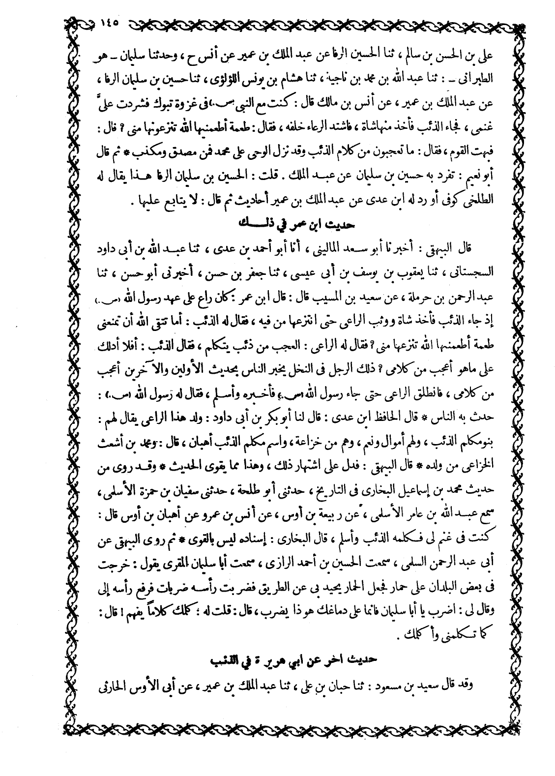 فَبُهِتَ الْقَوْمُ، فَقَالَ: مَا تَعْجَبُونَ مِنْ كَلَامِ الذِّئْبِ وَقَدْ نَزَلَ الْوَحْيُ عَلَى مُحَمَّدٍ فَمِنْ مُصَدِّقٍ وَمُكَذِّبٍ ثُمَّ قَالَ أَبُو نُعَيْمٍ: تَفَرَّدَ بِهِ حُسَيْنُ بْنُ سُلَيْمَانَ عَنْ عَبْدِ الْمَلِكِ. قُلْتُ: الْحُسَيْنُ بْنُ سُلَيْمَانَ الرفّاء هذا يقال له الطلخى كُوفِيٌّ أَوْرَدَ لَهُ ابْنُ عَدِيٍّ عَنْ عَبْدِ الْمَلِكِ بْنِ عُمَيْرٍ أَحَادِيثَ ثُمَّ قَالَ: لَا يُتَابَعُ عَلَيْهَا.