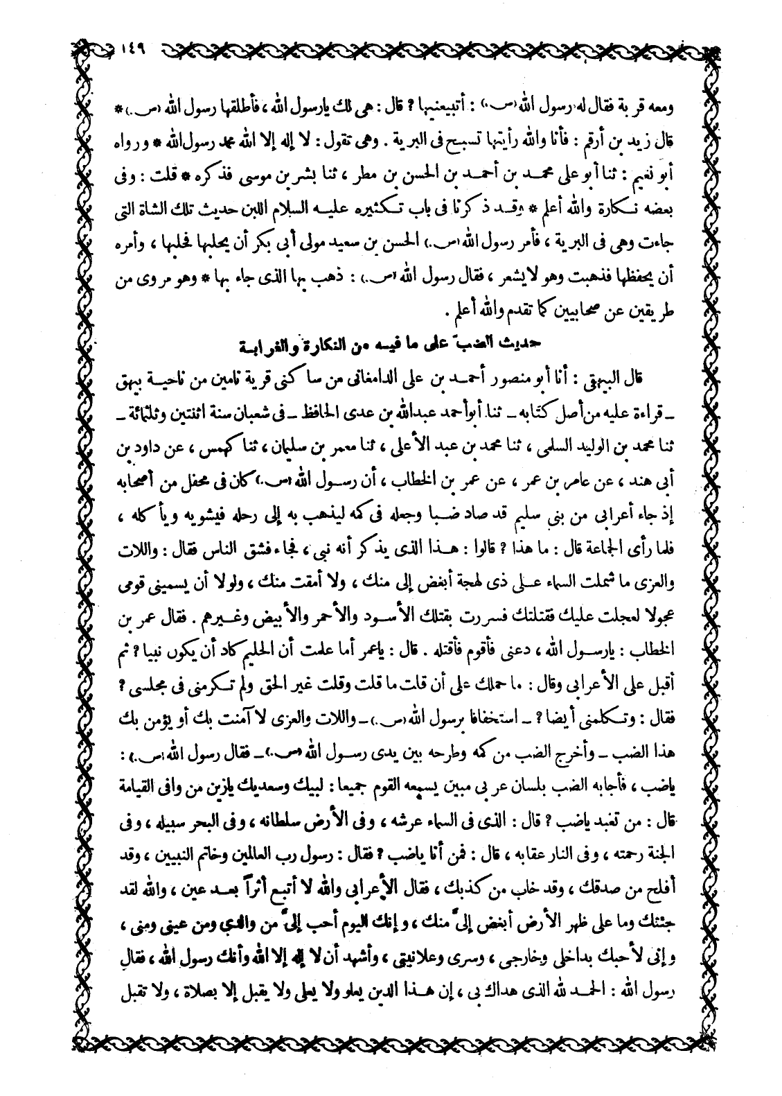 قَالَ الْبَيْهَقِيُّ: أَنَا أَبُو مَنْصُورٍ أَحْمَدُ بْنُ عَلِيٍّ الدَّامَغَانِيُّ مِنْ سَاكِنِي قَرْيَةِ نَامِينَ مِنْ نَاحِيَةِ بَيْهَقَ- قِرَاءَةً عَلَيْهِ مِنْ أَصْلِ كِتَابِهِ- ثَنَا أَبُو أَحْمَدَ عَبْدُ اللَّهِ بْنُ عَدِيٍّ الْحَافِظُ- فِي شَعْبَانَ سَنَةَ اثْنَتَيْنِ وَثَلَاثِمِائَةٍ- ثنا محمد بْنِ الْوَلِيدِ السُّلَمِيِّ، ثَنَا مُحَمَّدُ بْنُ عَبْدِ الأعلى، ثنا معمر بْنُ سُلَيْمَانَ، ثَنَا كَهَمْسٌ، عَنْ دَاوُدَ بْنِ أَبِي هِنْدَ، عَنْ عَامِرٍ بن عُمَرَ، عَنْ عُمَرُ بْنُ الْخَطَّابِ، أَنَّ رَسُولَ اللَّهِ صَلَّى اللَّهُ عَلَيْهِ وَسَلَّمَ كَانَ فِي مَحْفَلٍ مِنْ أَصْحَابِهِ إِذْ جَاءَ أَعْرَابِيٌّ مِنْ بَنِي سُلَيْمٍ قَدْ صَادَ ضَبًّا وَجَعَلَهُ فِي كُمِّهِ لِيَذْهَبَ بِهِ إِلَى رَحْلِهِ فَيَشْوِيَهُ وَيَأْكُلَهُ، فَلَمَّا رَأَى الْجَمَاعَةَ قَالَ: مَا هَذَا؟ قَالُوا: هَذَا الَّذِي يَذْكُرُ أَنَّهُ نَبِيٌّ، فَجَاءَ فَشَقَّ الناس فقال: واللات والعزى ما شملت السماء عَلَى ذِي لَهْجَةٍ أَبْغَضَ إِلَيَّ مِنْكَ، وَلَا أَمْقُتُ مِنْكَ، وَلَوْلَا أَنْ يُسَمِّيَنِي قَوْمِي عَجُولًا لَعَجِلْتُ عَلَيْكَ فَقَتَلْتُكَ فَسَرَرْتُ بِقَتْلِكَ الْأَسْوَدَ وَالْأَحْمَرَ وَالْأَبْيَضَ وَغَيْرَهُمْ. فَقَالَ عُمَرُ بْنُ الْخَطَّابِ: يَا رَسُولَ اللَّهِ، دَعْنِي فَأَقُومَ فَأَقْتُلَهُ. قَالَ: يَا عُمَرُ أَمَا عَلِمْتَ أَنَّ الْحَلِيمَ كَادَ أَنْ يَكُونَ نَبِيًّا؟ ثُمَّ أَقْبَلَ عَلَى الْأَعْرَابِيِّ وَقَالَ: مَا حَمَلَكَ عَلَى أَنْ قُلْتَ مَا قُلْتَ وَقُلْتَ غَيْرَ الْحَقِّ وَلَمْ تُكْرِمْنِي فِي مَجْلِسِي؟