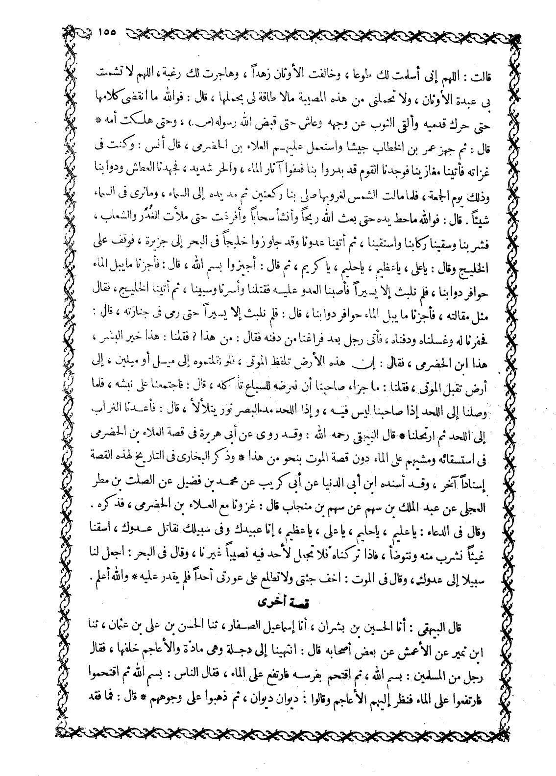 قالت: اللَّهمّ إني أسلمت لك طوعا، وخالفت الْأَوْثَانَ زُهْدًا، وَهَاجَرْتُ لَكَ رَغْبَةً، اللَّهمّ لَا تشمت بي عبدة الأوثان، ولا تحملني من هَذِهِ الْمُصِيبَةِ مَا لَا طَاقَةَ لِي بِحَمْلِهَا، قال: فو الله مَا انْقَضَى كَلَامُهَا حَتَّى حَرَّكَ قَدَمَيْهِ وَأَلْقَى الثَّوْبَ عَنْ وَجْهِهِ وَعَاشَ حَتَّى قَبَضَ اللَّهُ رَسُولَهُ صَلَّى اللَّهُ عَلَيْهِ وَسَلَّمَ، وَحَتَّى هَلَكَتْ أُمُّهُ قَالَ: ثُمَّ جَهَّزَ عُمَرُ بْنُ الْخَطَّابِ جيشا واستعمل عليهم العلاء بن الحضرمي، قال أنس: وكنت في غزاته فأتينا مغازينا فوجدنا القوم قد بدروا بنا فعفوا آثار الماء، والحر شديد، فجهدنا الْعَطَشُ وَدَوَابَّنَا وَذَلِكَ يَوْمُ الْجُمُعَةِ، فَلَمَّا مَالَتِ الشَّمْسُ لِغُرُوبِهَا صَلَّى بِنَا رَكْعَتَيْنِ ثُمَّ مَدَّ يَدَهُ إِلَى السَّمَاءِ، وَمَا نَرَى فِي السَّمَاءِ شيئا. قال: فو الله مَا حَطَّ يَدَهُ حَتَّى بَعَثَ اللَّهُ رِيحًا وَأَنْشَأَ سَحَابًا وَأَفْرَغَتْ حَتَّى مَلَأَتِ الْغُدُرَ وَالشِّعَابَ، فَشَرِبْنَا وَسَقَيْنَا رِكَابَنَا وَاسْتَقَيْنَا، ثُمَّ أَتَيْنَا عَدُوَّنَا وَقَدْ جَاوَزُوا خَلِيجًا فِي الْبَحْرِ إِلَى جَزِيرَةٍ، فَوَقَفَ عَلَى الْخَلِيجِ وَقَالَ: يَا عَلِيُّ، يَا عَظِيمُ، يَا حَلِيمُ، يَا كَرِيمُ، ثُمَّ قَالَ: أَجِيزُوا بِسْمِ اللَّهِ، قَالَ: فَأَجَزْنَا مَا يَبُلُّ الْمَاءُ حَوَافِرَ دَوَابِّنَا، فَلَمْ نَلْبَثْ إِلَّا يَسِيرًا فأصبنا العدو عليه فَقَتَلْنَا وَأَسَرْنَا وَسَبَيْنَا، ثُمَّ أَتَيْنَا الْخَلِيجَ، فَقَالَ مِثْلَ مَقَالَتِهِ، فَأَجَزْنَا مَا يَبُلُّ الْمَاءُ حَوَافِرَ دَوَابِّنَا، قَالَ: فَلَمْ نَلْبَثْ إِلَّا يَسِيرًا حَتَّى رُمِيَ فِي جِنَازَتِهِ، قَالَ: