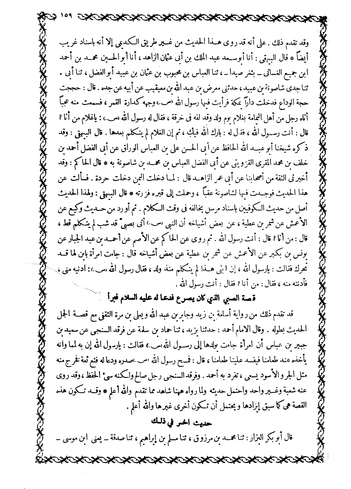 قَالَ: أَنْتَ رَسُولُ اللَّهِ، فَقَالَ لَهُ: بَارَكَ اللَّهُ فِيكَ، ثُمَّ إِنَّ الْغُلَامَ لَمْ يَتَكَلَّمْ بَعْدَهَا. قَالَ الْبَيْهَقِيُّ: وَقَدْ ذَكَرَهُ شَيْخُنَا أَبُو عَبْدِ اللَّهِ الْحَافِظُ عَنْ أَبِي الْحَسَنِ عَلِيِّ بْنِ الْعَبَّاسِ الْوَرَّاقِ عَنْ أَبِي الْفَضْلِ أحمد بن خلف بن محمد المقري الْقَزْوِينِيِّ عَنْ أَبِي الْفَضْلِ الْعَبَّاسِ بْنِ مُحَمَّدِ بْنِ شَاصُونَةِ بِهِ قَالَ الْحَاكِمُ: وَقَدْ أَخْبَرَنِي الثِّقَةُ مِنْ أَصْحَابِنَا عَنْ أَبِي عُمَرَ الزَّاهِدِ قَالَ: لَمَّا دَخَلْتُ الْيَمَنَ دَخَلْتُ حَرْدَةَ. فَسَأَلْتُ عَنْ هَذَا الْحَدِيثِ فَوَجَدْتُ فِيهَا لِشَاصُونَةَ عَقِبًا، وَحُمِلْتُ إِلَى قَبْرِهِ فَزُرْتُهُ قَالَ الْبَيْهَقِيُّ: وَلِهَذَا الْحَدِيثِ أَصِلٌ مِنْ حَدِيثِ الْكُوفِيِّينَ بِإِسْنَادٍ مُرْسَلٍ يُخَالِفُهُ فِي وَقْتِ الْكَلَامِ. ثُمَّ أَوْرَدَ مِنْ حَدِيثِ وَكِيعٍ عَنِ الْأَعْمَشِ عَنْ شِمْرِ بْنِ عَطِيَّةَ، عَنْ بَعْضِ أَشْيَاخِهِ أَنَّ النَّبِيَّ صَلَّى اللَّهُ عَلَيْهِ وَسَلَّمَ أَتَى بِصَبِيٍّ قَدْ شَبَّ لَمْ يَتَكَلَّمْ قَطُّ، قَالَ: مَنْ أَنَا؟ قَالَ: أَنْتَ رَسُولُ اللَّهِ. ثُمَّ رَوَى عَنِ الْحَاكِمِ عَنِ الْأَصَمِّ عَنْ أَحْمَدَ بْنِ عَبْدِ الْجَبَّارِ عَنْ يُونُسَ بْنِ بُكَيْرٍ عَنِ الْأَعْمَشِ عَنْ شِمْرِ بْنِ عَطِيَّةَ عَنْ بَعْضِ أَشْيَاخِهِ قَالَ: جَاءَتِ امْرَأَةٌ بِابْنٍ لَهَا قَدْ تَحَرَّكَ فَقَالَتْ: يَا رَسُولَ اللَّهِ، إِنَّ ابْنِي هَذَا لَمْ يَتَكَلَّمْ مُنْذُ وُلِدَ، فَقَالَ رَسُولُ اللَّهِ صَلَّى اللَّهُ عَلَيْهِ وَسَلَّمَ: أَدْنِيهِ مِنِّي، فَأَدْنَتْهُ مِنْهُ، فَقَالَ: مَنْ أَنَا؟ فَقَالَ: أَنْتَ رَسُولُ اللَّهِ.