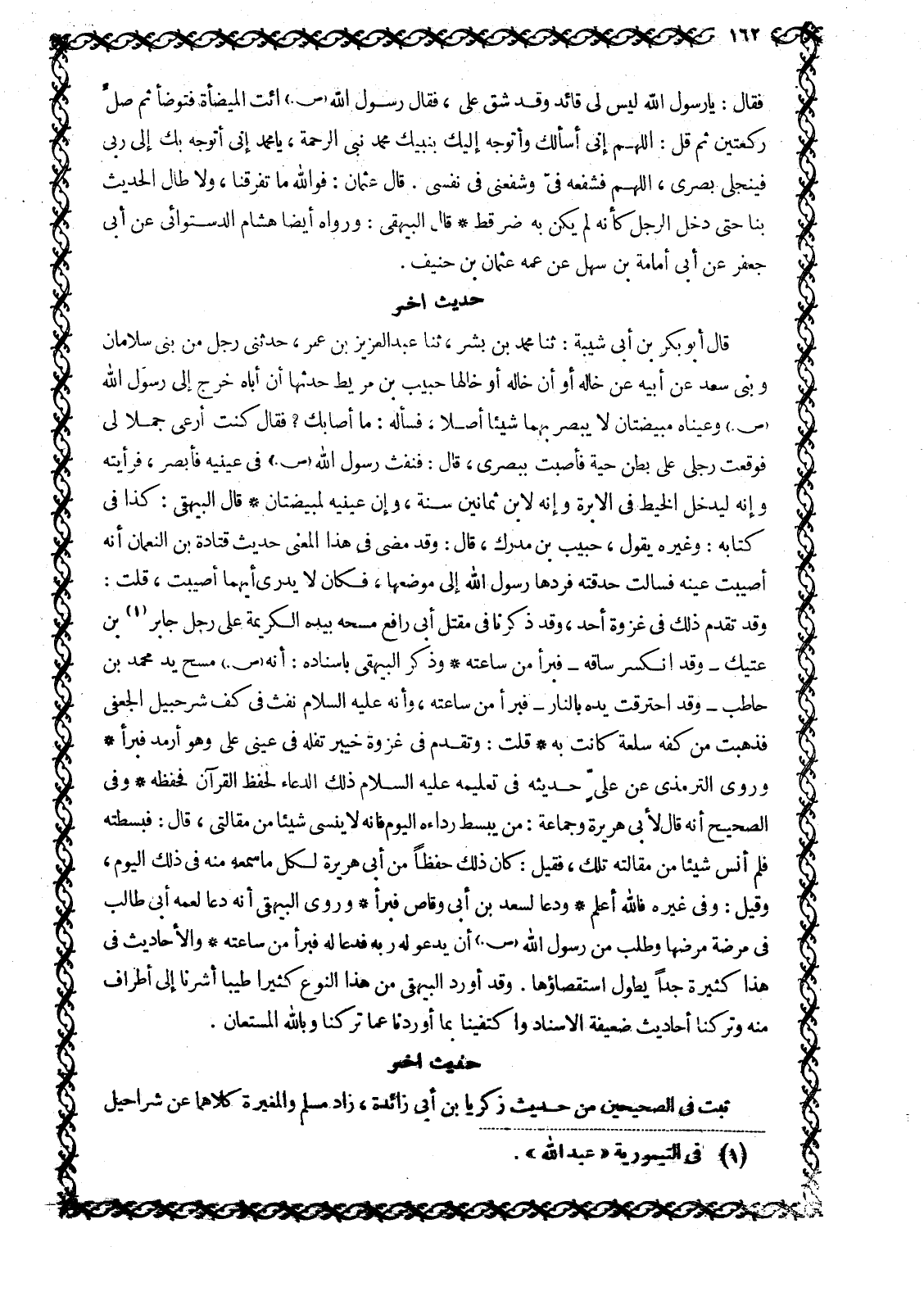 فَقَالَ: يَا رَسُولَ اللَّهِ لَيْسَ لِي قَائِدٌ وَقَدْ شَقَّ عَلَيَّ، فَقَالَ رَسُولُ اللَّهِ صَلَّى اللَّهُ عَلَيْهِ وَسَلَّمَ ائْتِ الْمِيضَأَةَ فَتَوَضَّأْ ثُمَّ صلّ ركعتين ثم قال: اللَّهمّ إِنِّي أَسْأَلُكَ وَأَتَوَجَّهُ إِلَيْكَ بِنَبِيِّكَ مُحَمَّدٍ نَبِيِّ الرَّحْمَةِ، يَا مُحَمَّدُ إِنِّي أَتَوَجَّهُ بِكَ إلى ربى فينجلي بَصَرِي، اللَّهمّ فَشَفِّعْهُ فِيَّ وَشَفِّعْنِي فِي نَفْسِي. قال عثمان: فو الله مَا تَفَرَّقْنَا، وَلَا طَالَ الْحَدِيثُ بِنَا حَتَّى دخل الرجل كأنه لَمْ يَكُنْ بِهِ ضُرٌّ قَطُّ قَالَ الْبَيْهَقِيُّ: وَرَوَاهُ أَيْضًا هِشَامٌ الدَّسْتُوَائِيُّ عَنْ أَبِي جَعْفَرٍ عَنْ أَبِي أُمَامَةَ بْنِ سَهْلٍ عَنْ عَمِّهِ عُثْمَانَ بْنِ حُنَيْفٍ.