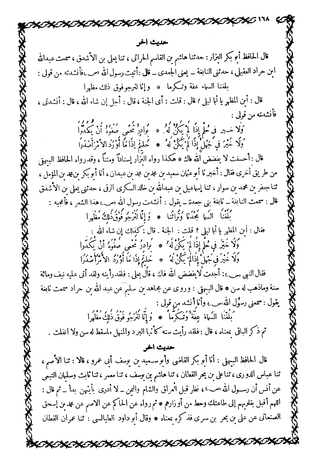 قَالَ: أَحْسَنْتَ لَا يَفْضُضِ اللَّهُ فَاكَ هَكَذَا رَوَاهُ الْبَزَّارُ إِسْنَادًا وَمَتْنًا، وَقَدْ رَوَاهُ الْحَافِظُ الْبَيْهَقِيُّ مِنْ طَرِيقٍ أُخْرَى فَقَالَ: أَخْبَرَنَا أَبُو عُثْمَانَ سَعِيدُ بْنُ مُحَمَّدِ بْنِ مُحَمَّدِ بْنِ عَبْدَانَ، أَنَا أَبُو بكر بن مُحَمَّدُ بْنُ الْمُؤَمَّلُ، ثَنَا جَعْفَرُ بْنُ مُحَمَّدِ بْنِ سَوَّارٍ، ثَنَا إِسْمَاعِيلُ بْنُ عَبْدِ اللَّهِ بْنِ خَالِدٍ السُّكَّرِيُّ الرَّقِّيُّ، حَدَّثَنِي يَعْلَى بْنُ الْأَشْدَقِ قَالَ: سَمِعْتُ النَّابِغَةَ- نَابِغَةَ بَنِي جَعْدَةَ- يَقُولُ: أَنْشَدْتُ رَسُولَ اللَّهِ صَلَّى اللَّهُ عَلَيْهِ وَسَلَّمَ هَذَا الشعر، فأعجبه: