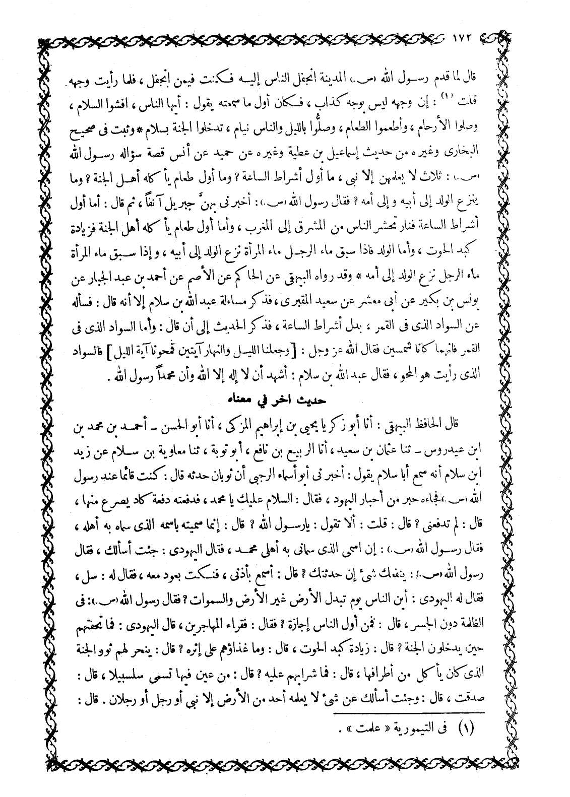 قَالَ لَمَّا قَدِمَ رَسُولُ اللَّهِ صَلَّى اللَّهُ عَلَيْهِ وَسَلَّمَ الْمَدِينَةَ انْجَفَلَ النَّاسُ إِلَيْهِ فَكُنْتُ فيمن انجفل، فلما رأيت وجهه قلت [1] : أَنَّ وَجْهَهُ لَيْسَ بِوَجْهٍ كَذَّابٍ، فَكَانَ أَوَّلَ مَا سَمِعْتُهُ يَقُولُ: أَيُّهَا النَّاسُ، أَفْشُوا السَّلَامَ، وَصِلُوا الْأَرْحَامَ، وَأَطْعِمُوا الطَّعَامَ، وَصَلُّوا بِاللَّيْلِ وَالنَّاسُ نِيَامٍ، تَدْخُلُوا الْجَنَّةَ بِسَلَامٍ وَثَبَتَ فِي صَحِيحِ البخاري وغيره من حديث إسماعيل بن عطية وَغَيْرِهِ عَنْ حُمَيْدٍ عَنْ أَنَسٍ قِصَّةُ سُؤَالِهِ رَسُولُ اللَّهِ صَلَّى اللَّهُ عَلَيْهِ وَسَلَّمَ: ثَلَاثَ لَا يَعْلَمُهُنَّ إِلَّا نَبِيٌّ، مَا أَوَّلُ أَشْرَاطِ السَّاعَةِ؟ وَمَا أَوَّلُ طَعَامٍ يَأْكُلُهُ أَهْلُ الْجَنَّةِ؟ وَمَا يَنْزِعُ الْوَلَدُ إِلَى أَبِيهِ وَإِلَى أُمِّهِ؟ فَقَالَ رَسُولُ اللَّهِ صَلَّى اللَّهُ عَلَيْهِ وَسَلَّمَ: أَخْبَرَنِي بِهِنَّ جِبْرِيلُ آنِفًا، ثُمَّ قَالَ: أَمَّا أَوَّلُ أَشْرَاطِ السَّاعَةِ فَنَارٌ تَحْشُرُ النَّاسِ مِنَ الْمَشْرِقِ إِلَى الْمَغْرِبِ، وَأَمَّا أَوَّلُ طَعَامٍ يَأْكُلُهُ أَهْلُ الْجَنَّةِ فَزِيَادَةُ كَبِدِ الْحُوتِ، وَأَمَّا الْوَلَدُ فَإِذَا سَبَقَ مَاءُ الرَّجُلِ مَاءَ الْمَرْأَةِ نَزَعَ الْوَلَدَ إِلَى أَبِيهِ، وَإِذَا سَبَقَ مَاءُ الْمَرْأَةِ مَاءَ الرَّجُلِ نَزَعَ الْوَلَدُ إِلَى أُمِّهِ وَقَدْ رَوَاهُ الْبَيْهَقِيُّ عَنِ الْحَاكِمِ عَنِ الْأَصَمِّ عَنْ أَحْمَدَ بْنِ عَبْدِ الْجَبَّارِ عَنْ يُونُسَ بن بُكَيْرٍ عَنْ أَبِي مَعْشَرٍ عَنْ سَعِيدٍ الْمَقْبُرِيُّ، فَذَكَرَ مُسَاءَلَةَ عَبْدِ اللَّهِ بْنِ سَلَامٍ إِلَّا أَنَّهُ قَالَ: فَسَأَلَهُ عَنِ السَّوَادِ الَّذِي فِي الْقَمَرِ، بَدَلَ أَشْرَاطِ السَّاعَةِ، فَذَكَرَ الْحَدِيثَ إِلَى أَنْ قَالَ: وَأَمَّا السَّوَادُ الَّذِي فِي الْقَمَرِ فَإِنَّهُمَا كَانَا شَمْسَيْنِ فَقَالَ اللَّهُ عَزَّ وَجَلَّ: وَجَعَلْنَا اللَّيْلَ وَالنَّهارَ آيَتَيْنِ فَمَحَوْنا آيَةَ اللَّيْلِ 17: 12 فَالسَّوَادُ الَّذِي رَأَيْتَ هُوَ الْمَحْوُ، فَقَالَ عَبْدُ اللَّهِ بْنُ سَلَامٍ: أَشْهَدُ أَنْ لَا إِلَهَ إِلَّا اللَّهُ وَأَنَّ مُحَمَّدًا رَسُولُ اللَّهِ.
