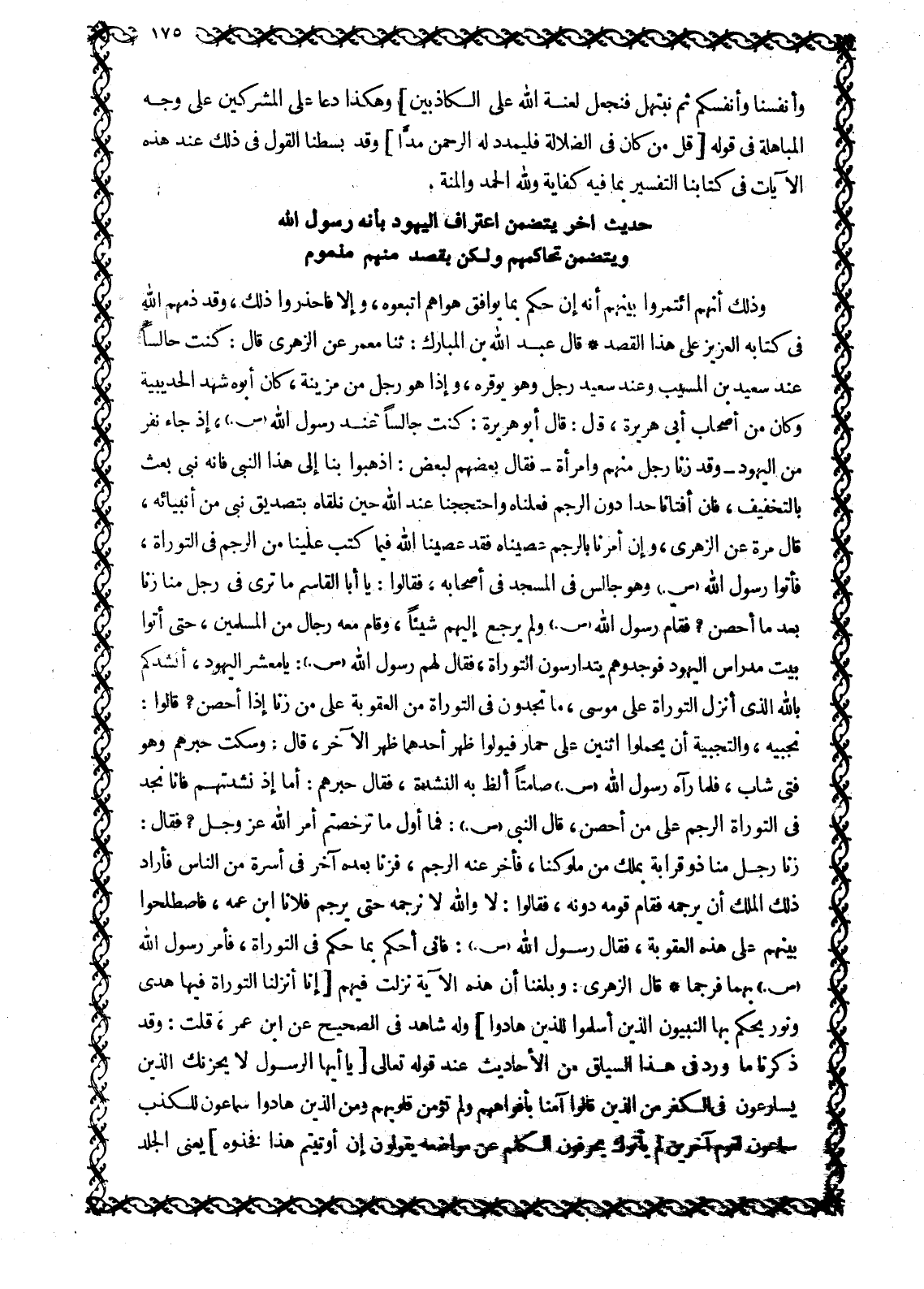 حَدِيثٌ آخَرُ يَتَضَمَّنُ اعْتِرَافَ الْيَهُودِ بِأَنَّهُ رَسُولُ الله وَيَتَضَمَّنُ تَحَاكُمَهُمْ إِلَيْهِ وَرُجُوعَهُمْ إِلَى مَا يَحْكُمُ بِهِ وَلَكِنْ بِقَصْدٍ مِنْهُمْ مَذْمُومٍ