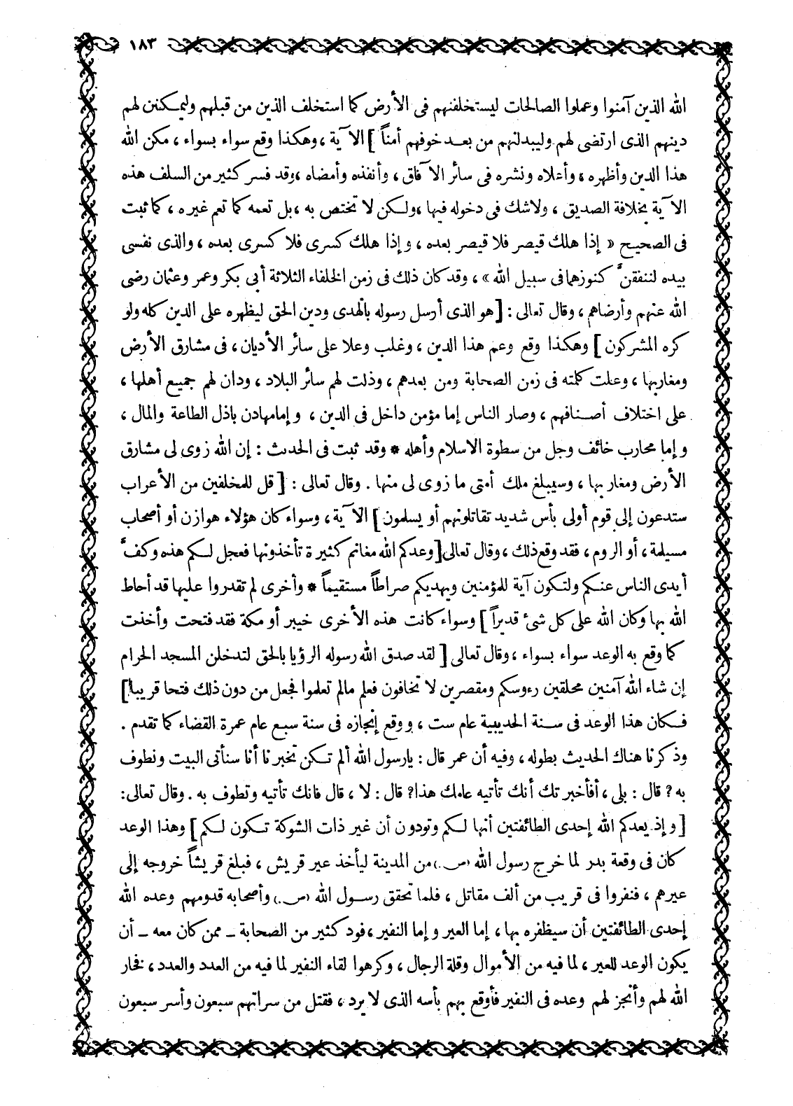 الَّذِينَ آمَنُوا مِنْكُمْ وَعَمِلُوا الصَّالِحاتِ لَيَسْتَخْلِفَنَّهُمْ فِي الْأَرْضِ كَمَا اسْتَخْلَفَ الَّذِينَ مِنْ قَبْلِهِمْ وَلَيُمَكِّنَنَّ لَهُمْ دِينَهُمُ الَّذِي ارْتَضى لَهُمْ وَلَيُبَدِّلَنَّهُمْ مِنْ بَعْدِ خَوْفِهِمْ أَمْناً 24: 55 الآية، وَهَكَذَا وَقَعَ سَوَاءً بِسَوَاءٍ، مَكَّنَ اللَّهُ هَذَا الدِّينَ وَأَظْهَرَهُ، وَأَعْلَاهُ وَنَشَرَهُ فِي سَائِرِ الْآفَاقِ، وَأَنْفَذَهُ وَأَمْضَاهُ، وَقَدْ فَسَّرَ كَثِيرٌ مِنَ السَّلَفِ هَذِهِ الْآيَةَ بِخِلَافَةِ الصِّدِّيقِ، وَلَا شَكَّ فِي دُخُولِهِ فِيهَا، وَلَكِنْ لَا تَخْتَصُّ بِهِ، بَلْ تَعُمُّهُ كَمَا تَعُمُّ غَيْرَهُ، كَمَا ثَبَتَ فِي الصَّحِيحِ «إِذَا هَلَكَ قَيْصَرُ فَلَا قَيْصَرَ بَعْدَهُ، وَإِذَا هَلَكَ كِسْرَى فَلَا كِسْرَى بَعْدَهُ، وَالَّذِي نَفْسِي بيده لننفقنّ كُنُوزَهُمَا فِي سَبِيلِ اللَّهِ» ، وَقَدْ كَانَ ذَلِكَ فِي زَمَنِ الْخُلَفَاءِ الثَّلَاثَةِ أَبِي بَكْرٍ وَعُمَرَ وَعُثْمَانَ رَضِيَ اللَّهُ عَنْهُمْ وَأَرْضَاهُمْ، وَقَالَ تَعَالَى: هُوَ الَّذِي أَرْسَلَ رَسُولَهُ بِالْهُدى وَدِينِ الْحَقِّ لِيُظْهِرَهُ عَلَى الدِّينِ كُلِّهِ وَلَوْ كَرِهَ الْمُشْرِكُونَ 9: 33 وَهَكَذَا وَقَعَ وَعَمَّ هَذَا الدِّينُ، وَغَلَبَ وَعَلَا عَلَى سَائِرِ الْأَدْيَانِ، فِي مَشَارِقِ الْأَرْضِ وَمَغَارِبِهَا، وَعَلَتْ كَلِمَتُهُ فِي زَمَنِ الصَّحَابَةِ وَمَنْ بَعَدَهُمْ، وَذَلَّتْ لَهُمْ سَائِرُ الْبِلَادِ، وَدَانَ لَهُمْ جَمِيعُ أَهْلِهَا، عَلَى اخْتِلَافِ أَصْنَافِهِمْ، وَصَارَ النَّاسُ إِمَّا مؤمن داخل في الدين، وإما مهادن باذل الطاعة والمال، وإما محارب خائف وجل مِنْ سَطْوَةِ الْإِسْلَامِ وَأَهْلِهِ وَقَدْ ثَبَتَ فِي الحديث: إن الله زوى لي مشارق الأرض وَمَغَارِبَهَا، وَسَيَبْلُغُ مُلْكُ أُمَّتِي مَا زَوَى لِي مِنْهَا. وَقَالَ تَعَالَى: قُلْ لِلْمُخَلَّفِينَ مِنَ الْأَعْرابِ سَتُدْعَوْنَ إِلى قَوْمٍ أُولِي بَأْسٍ شَدِيدٍ تُقاتِلُونَهُمْ أَوْ يُسْلِمُونَ 48: 16 الآية، وسواء كان هؤلاء هَوَازِنَ أَوْ أَصْحَابَ مُسَيْلِمَةَ، أَوِ الرُّومَ، فَقَدْ وَقَعَ ذَلِكَ، وَقَالَ تَعَالَى وَعَدَكُمُ اللَّهُ مَغانِمَ كَثِيرَةً تَأْخُذُونَها فَعَجَّلَ لَكُمْ هذِهِ وَكَفَّ أَيْدِيَ النَّاسِ عَنْكُمْ وَلِتَكُونَ آيَةً لِلْمُؤْمِنِينَ وَيَهْدِيَكُمْ صِراطاً مُسْتَقِيماً وَأُخْرى لَمْ تَقْدِرُوا عَلَيْها قَدْ أَحاطَ اللَّهُ بِها وَكانَ اللَّهُ عَلى كُلِّ شَيْءٍ قَدِيراً 48: 20- 21 وَسَوَاءٌ كَانَتْ هَذِهِ الْأُخْرَى خَيْبَرَ أَوْ مَكَّةَ فَقَدْ فُتِحَتْ وَأُخِذَتْ كَمَا وَقَعَ بِهِ الْوَعْدُ سَوَاءً بِسَوَاءٍ، وَقَالَ تَعَالَى لَقَدْ صَدَقَ اللَّهُ رَسُولَهُ الرُّؤْيا بِالْحَقِّ لَتَدْخُلُنَّ الْمَسْجِدَ الْحَرامَ إِنْ شاءَ اللَّهُ آمِنِينَ مُحَلِّقِينَ رُؤُسَكُمْ وَمُقَصِّرِينَ لَا تَخافُونَ فَعَلِمَ مَا لَمْ تَعْلَمُوا فَجَعَلَ من دُونِ ذلِكَ فَتْحاً قَرِيباً 48: 27 فَكَانَ هَذَا الْوَعْدُ فِي سَنَةِ الْحُدَيْبِيَةِ عَامَ سِتٍّ، وَوَقَعَ إِنْجَازُهُ فِي سَنَةِ سَبْعٍ عَامَ عُمْرَةِ الْقَضَاءِ كَمَا تَقَدَّمَ.