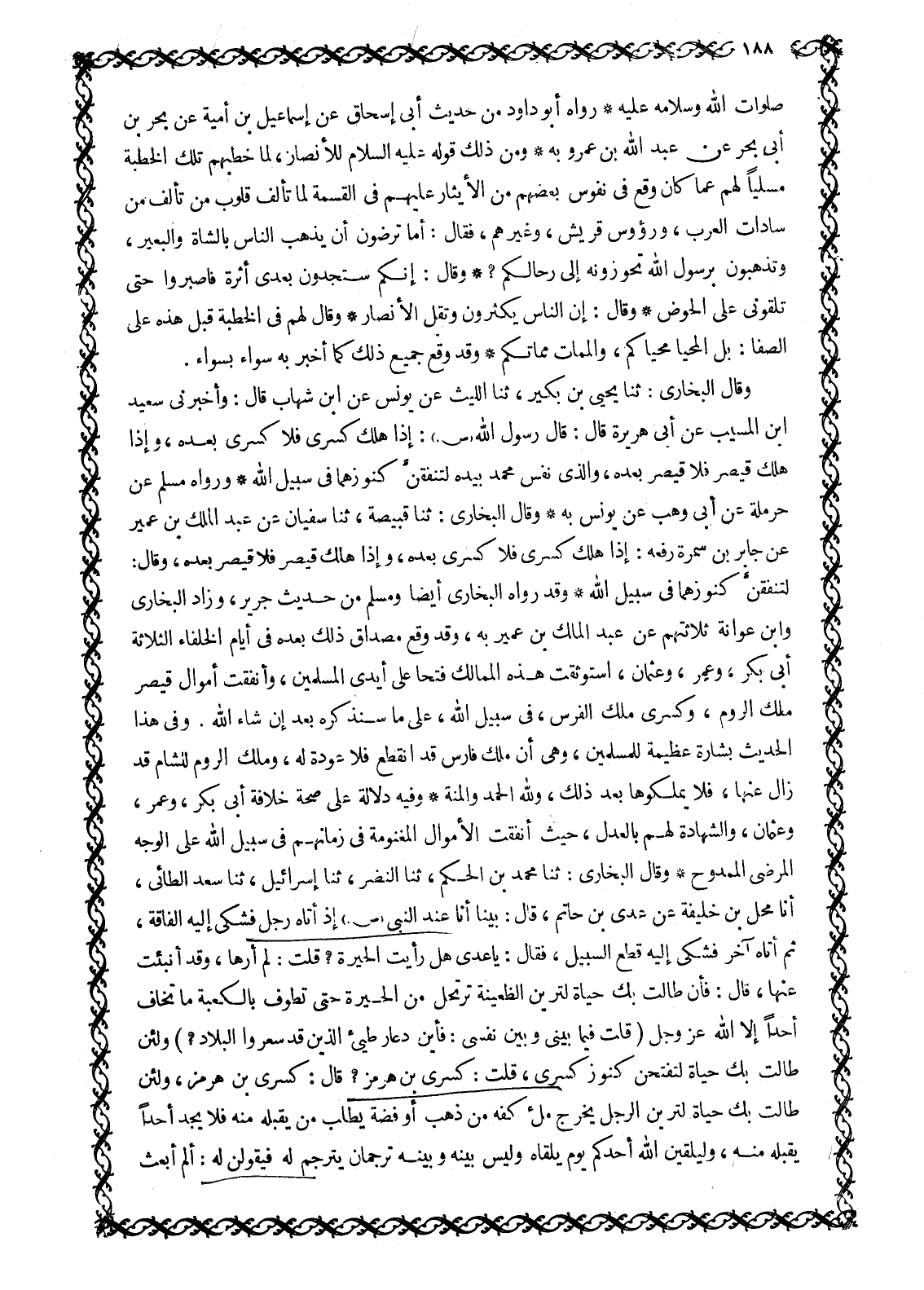 لَتُنْفِقُنَّ كُنُوزَهُمَا فِي سَبِيلِ اللَّهِ وَقَدْ رَوَاهُ الْبُخَارِيُّ أَيْضًا وَمُسْلِمٌ مِنْ حَدِيثِ جرير، وزاد البخاري وابن عَوَانَةَ ثَلَاثَتُهُمْ عَنْ عَبْدِ الْمَلِكِ بْنِ عُمَيْرٍ بِهِ، وَقَدْ وَقَعَ مِصْدَاقُ ذَلِكَ بَعْدَهُ فِي أَيَّامِ الْخُلَفَاءِ الثَّلَاثَةِ أَبِي بَكْرٍ، وَعُمَرَ، وَعُثْمَانَ، اسْتَوْثَقَتْ هَذِهِ الْمَمَالِكُ فَتْحًا عَلَى أَيْدِي الْمُسْلِمِينَ، وأنفقت أموال قَيْصَرَ مَلِكِ الرُّومِ، وَكِسْرَى مَلِكِ الْفُرْسِ، فِي سَبِيلِ اللَّهِ، عَلَى مَا سَنَذْكُرُهُ بَعْدُ إِنْ شَاءَ اللَّهُ. وَفِي هَذَا الْحَدِيثِ بِشَارَةٌ عَظِيمَةٌ للمسلمين، وهي أَنَّ مُلْكَ فَارِسَ قَدِ انْقَطَعَ فَلَا عَوْدَةَ لَهُ، وَمُلْكَ الرُّومِ لِلشَّامِ قَدْ زَالَ عَنْهَا، فلا يملكوها بَعْدَ ذَلِكَ، وللَّه الْحَمْدُ وَالْمِنَّةُ وَفِيهِ دَلَالَةٌ عَلَى صِحَّةِ خِلَافَةِ أَبِي بَكْرٍ، وَعُمَرَ، وَعُثْمَانَ، وَالشَّهَادَةِ لَهُمْ بِالْعَدْلِ، حَيْثُ أُنْفِقَتِ الْأَمْوَالُ الْمَغْنُومَةُ فِي زَمَانِهِمْ فِي سَبِيلِ اللَّهِ عَلَى الْوَجْهِ الْمَرْضِيِّ الْمَمْدُوحِ وَقَالَ الْبُخَارِيُّ: ثَنَا مُحَمَّدُ بْنُ الْحَكَمِ، ثَنَا النَّضْرُ، ثَنَا إِسْرَائِيلُ، ثَنَا سَعْدٌ الطَّائِيُّ، أَنَا مُحِلُّ بْنُ خَلِيفَةَ عَنْ عَدِيِّ بْنِ حَاتِمٍ، قَالَ: بَيْنَا أَنَا عِنْدَ النَّبِيِّ صَلَّى اللَّهُ عَلَيْهِ وَسَلَّمَ إِذْ أَتَاهُ رَجُلٌ فَشَكَى إِلَيْهِ الْفَاقَةَ، ثُمَّ أَتَاهُ آخَرُ فَشَكَى إِلَيْهِ قَطْعَ السَّبِيلِ، فَقَالَ: يَا عَدِيُّ هَلْ رَأَيْتَ الْحِيرَةَ؟ قُلْتُ: لَمْ أَرَهَا، وَقَدْ أُنْبِئْتُ عَنْهَا، قَالَ: فَإِنْ طَالَتْ بِكَ حَيَاةٌ لَتَرَيَنَّ الظَّعِينَةَ تَرْتَحِلُ مِنَ الْحِيرَةِ حَتَّى تَطُوفَ بِالْكَعْبَةِ مَا تَخَافُ أَحَدًا إِلَّا اللَّهَ عَزَّ وَجَلَّ قُلْتُ فِيمَا بَيْنِي وَبَيْنَ نَفْسِي: فَأَيْنَ دُعَّارُ طيِّئ الَّذِينَ قَدْ سَعَّرُوا الْبِلَادَ؟ وَلَئِنْ طَالَتْ بِكَ حَيَاةٌ لَتُفْتَحَنَّ كُنُوزُ كِسْرَى، قُلْتُ: كِسْرَى بْنُ هُرْمُزَ؟ قَالَ: كِسْرَى بْنُ هُرْمُزَ، وَلَئِنْ طَالَتْ بِكَ حَيَاةٌ لَتَرَيَنَّ الرَّجُلَ يُخْرِجُ مَلْءَ كَفِّهِ مِنْ ذَهَبٍ أَوْ فِضَّةٍ يَطْلُبُ مَنْ يَقْبَلُهُ مِنْهُ فَلَا يَجِدُ أَحَدًا يَقْبَلُهُ مِنْهُ، وَلَيَلْقَيَنَّ اللَّهَ أَحَدُكُمْ يَوْمَ يَلْقَاهُ وَلَيْسَ بَيْنَهُ وبينه ترجمان يترجم له فيقولن لَهُ: أَلَمْ أَبْعَثْ