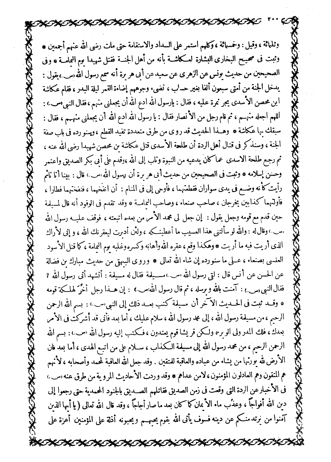 وثلاثمائة، وقيل: وخمسمائة، وكلهم اسْتَمَرَّ عَلَى السَّدَادِ وَالِاسْتِقَامَةِ حَتَّى مَاتَ رَضِيَ اللَّهُ عَنْهُمْ أَجْمَعِينَ وَثَبَتَ فِي صَحِيحِ الْبُخَارِيِّ الْبِشَارَةُ لِعُكَّاشَةَ بِأَنَّهُ مِنْ أَهْلِ الْجَنَّةِ فَقُتِلَ شَهِيدًا يَوْمَ الْيَمَامَةِ وَفِي الصَّحِيحَيْنِ مِنْ حَدِيثِ يُونُسَ عَنِ الزُّهْرِيِّ عَنْ سَعِيدٍ عَنْ أَبِي هُرَيْرَةَ أَنَّهُ سَمِعَ رَسُولَ اللَّهِ صَلَّى اللَّهُ عَلَيْهِ وَسَلَّمَ يَقُولُ: يَدْخُلُ الْجَنَّةَ مَنْ أَمْتَى سَبْعُونَ أَلْفًا بِغَيْرِ حِسَابٍ، تُضِيءُ وُجُوهُهُمْ إِضَاءَةَ القمر ليلة البدر، فقام عكاشة ابن مِحْصَنٍ الْأَسَدِيُّ يَجُرُّ نَمِرَةً عَلَيْهِ، فَقَالَ: يَا رَسُولَ اللَّهِ ادْعُ اللَّهَ أَنْ يَجْعَلَنِي مِنْهُمْ، فَقَالَ النَّبِيُّ صَلَّى اللَّهُ عَلَيْهِ وَسَلَّمَ: