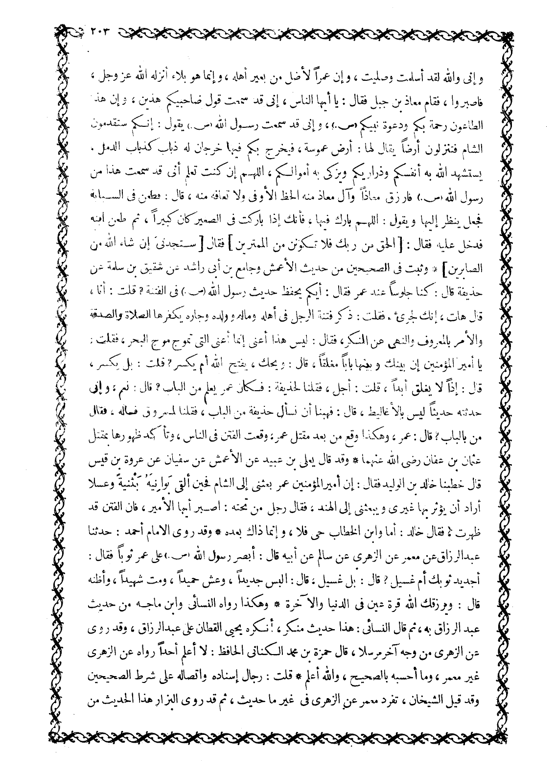 وَإِنِّي وَاللَّهِ لَقَدْ أَسْلَمْتُ وَصَلَّيْتُ، وَإِنَّ عَمْرًا لَأَضَلُّ مِنْ بَعِيرِ أَهْلِهِ، وَإِنَّمَا هُوَ بَلَاءٌ أَنْزَلَهُ اللَّهُ عَزَّ وَجَلَّ، فَاصْبِرُوا، فَقَامَ مُعَاذُ بْنُ جَبَلٍ فَقَالَ: يَا أَيُّهَا النَّاسُ، إِنِّي قَدْ سَمِعْتُ قَوْلَ صَاحِبَيْكُمْ هَذَيْنَ، وَإِنَّ هَذَا الطَّاعُونَ رَحْمَةٌ بِكُمْ وَدَعْوَةُ نَبِيِّكُمْ صَلَّى اللَّهُ عَلَيْهِ وَسَلَّمَ، وَإِنِّي قَدْ سَمِعْتُ رَسُولَ اللَّهِ صَلَّى اللَّهُ عَلَيْهِ وَسَلَّمَ يَقُولُ: إِنَّكُمْ سَتَقْدَمُونَ الشَّامَ فَتَنْزِلُونَ أَرْضًا يُقَالُ لَهَا: أَرْضُ عَمُوسَةَ، فَيَخْرُجُ بِكُمْ فِيهَا خُرْجَانٌ لَهُ ذُبَابٌ كَذُبَابِ الدُّمَّلِ، يَسْتَشْهِدُ اللَّهُ بِهِ أَنْفُسَكُمْ وَذَرَارِيَّكُمْ وَيُزَكِّي بِهِ أَمْوَالَكُمْ، اللَّهمّ إِنْ كُنْتَ تَعْلَمُ أَنِّي قَدْ سَمِعْتَ هَذَا مِنْ رَسُولِ اللَّهِ صَلَّى اللَّهُ عَلَيْهِ وَسَلَّمَ فَارْزُقْ مُعَاذًا وَآلَ مُعَاذٍ مِنْهُ الْحَظَّ الْأَوْفَى وَلَا تُعَافِهِ مِنْهُ، قَالَ: فَطُعِنَ فِي السَّبَّابَةِ فَجَعَلَ يَنْظُرُ إِلَيْهَا وَيَقُولُ: اللَّهمّ بَارِكْ فِيهَا، فَإِنَّكَ إِذَا بَارَكْتَ فِي الصَّغِيرِ كَانَ كَبِيرًا، ثُمَّ طُعِنَ ابْنُهُ فَدَخَلَ عَلَيْهِ فَقَالَ: الْحَقُّ مِنْ رَبِّكَ فَلا تَكُونَنَّ من الْمُمْتَرِينَ 2: 147 فَقَالَ سَتَجِدُنِي إِنْ شاءَ اللَّهُ مِنَ الصَّابِرِينَ 37: 102 وَثَبَتَ فِي الصَّحِيحَيْنِ مِنْ حَدِيثِ الْأَعْمَشِ وَجَامِعِ بْنِ أَبِي رَاشِدٍ عَنْ شَقِيقِ بْنِ سَلَمَةَ عَنْ حُذَيْفَةَ قَالَ: كُنَّا جُلُوسًا عِنْدَ عُمَرَ فَقَالَ: أَيُّكُمْ يَحْفَظُ حَدِيثَ رَسُولِ اللَّهِ صَلَّى اللَّهُ عَلَيْهِ وَسَلَّمَ فِي الْفِتْنَةِ؟ قُلْتُ: أَنَا، قَالَ هَاتِ، إِنَّكَ لِجَرِيءٌ، فَقُلْتُ: ذَكَرَ فِتْنَةُ الرَّجُلِ فِي أَهْلِهِ وَمَالِهِ وَوَلَدِهِ وَجَارِهِ يُكَفِّرُهَا الصَّلَاةُ وَالصَّدَقَةُ وَالْأَمْرُ بِالْمَعْرُوفِ وَالنَّهْيُ عَنِ الْمُنْكَرِ، فَقَالَ: لَيْسَ هَذَا أَعْنِي إِنَّمَا أَعْنِي الَّتِي تَمُوجُ مَوْجَ الْبَحْرِ، فَقُلْتُ: