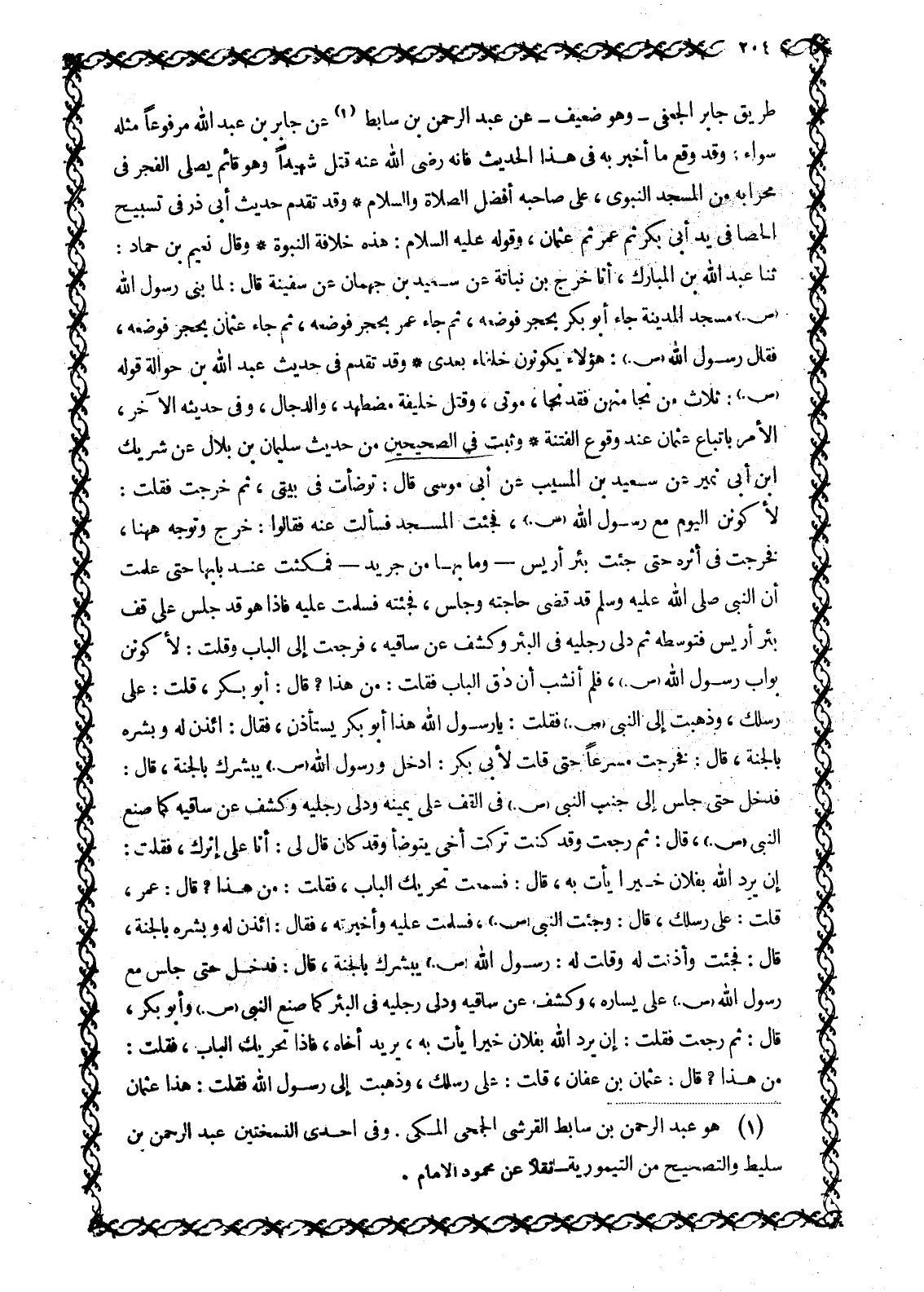 ثَنَا عَبْدُ اللَّهِ بْنُ المبارك، أنا خرج بن نباتة عن سعيد بن جهمان عَنْ سَفِينَةَ قَالَ: لَمَّا بَنَى رَسُولُ اللَّهِ صَلَّى اللَّهُ عَلَيْهِ وَسَلَّمَ مَسْجِدَ الْمَدِينَةِ جَاءَ أَبُو بَكْرٍ بِحَجَرٍ فَوَضَعَهُ، ثُمَّ جَاءَ عُمَرُ بِحَجَرٍ فَوَضَعَهُ، ثُمَّ جَاءَ عُثْمَانُ بِحَجَرٍ فَوَضَعَهُ، فَقَالَ رَسُولُ اللَّهِ صَلَّى اللَّهُ عَلَيْهِ وَسَلَّمَ: هؤلاء يكونون خلفاء بَعْدِي وَقَدْ تَقَدَّمَ فِي حَدِيثِ عَبْدِ اللَّهِ بْنِ حَوَالَةَ قَوْلُهُ صَلَّى اللَّهُ عَلَيْهِ وَسَلَّمَ: ثَلَاثٌ مَنْ نَجَا مِنْهُنَّ فَقَدْ نَجَا، مَوْتِي، وقتل خليفة مضطهد، وَالدَّجَّالُ، وَفِي حَدِيثِهِ الْآخَرِ، الْأَمْرُ بِاتِّبَاعِ عُثْمَانَ عِنْدَ وُقُوعِ الْفِتْنَةِ وَثَبَتَ فِي الصَّحِيحَيْنِ مِنْ حديث سليمان بن بلال عن شريك ابن أَبِي نُمَيْرٍ عَنْ سَعِيدِ بْنِ الْمُسَيَّبِ عَنْ أَبِي مُوسَى قَالَ: تَوَضَّأْتُ فِي بَيْتِي، ثُمَّ خَرَجْتُ فَقُلْتُ:
