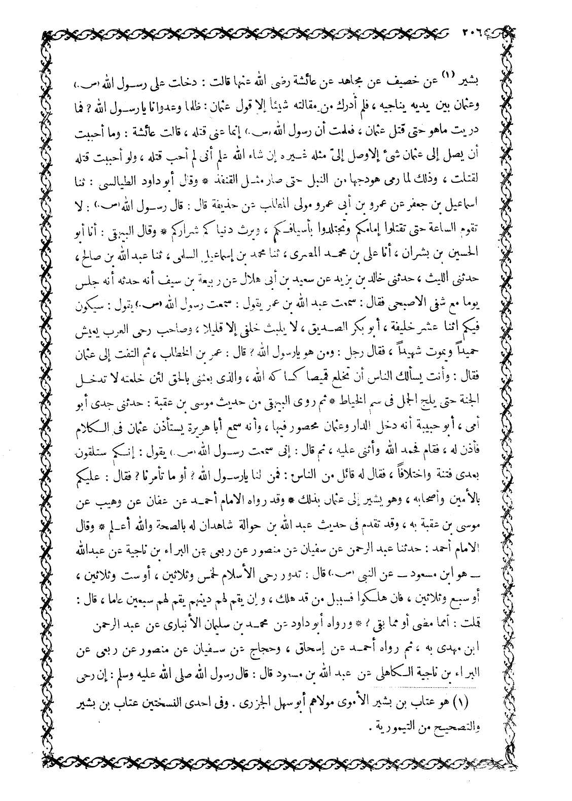 بَشِيرٍ [1] عَنْ خُصَيْفٍ عَنْ مُجَاهِدٍ عَنْ عَائِشَةَ رَضِيَ اللَّهُ عَنْهَا قَالَتْ: دَخَلْتُ عَلَى رَسُولِ اللَّهِ صَلَّى اللَّهُ عَلَيْهِ وَسَلَّمَ وَعُثْمَانُ بَيْنَ يَدَيْهِ يُنَاجِيهِ، فَلَمْ أُدْرِكْ مِنْ مَقَالَتِهِ شَيْئًا إلا قول عثمان: ظلما وَعُدْوَانًا يَا رَسُولَ اللَّهِ؟ فَمَا دَرَيْتُ مَا هُوَ حَتَّى قُتِلَ عُثْمَانُ، فَعَلِمْتُ أَنَّ رَسُولَ اللَّهِ صَلَّى اللَّهُ عَلَيْهِ وَسَلَّمَ إِنَّمَا عَنَى قَتْلَهُ، قَالَتْ عَائِشَةُ: وَمَا أَحْبَبْتُ أَنْ يَصِلَ إِلَى عُثْمَانَ شَيْءٌ إِلَّا وَصَلَ إِلَيَّ مِثْلُهُ غيره إن شاء اللَّهَ عَلِمَ أَنِّي لَمْ أُحِبَّ قَتْلَهُ، وَلَوْ أَحْبَبْتُ قَتْلَهُ لَقُتِلْتُ، وَذَلِكَ لَمَّا رُمِيَ هَوْدَجُهَا مِنَ النَّبْلِ حَتَّى صَارَ مِثْلَ الْقُنْفُذِ وَقَالَ أَبُو دَاوُدَ الطَّيَالِسِيُّ: ثَنَا إِسْمَاعِيلُ بْنُ جَعْفَرٍ عَنْ عَمْرِو بْنِ أَبِي عَمْرٍو مَوْلَى الْمُطَّلِبِ عَنْ حُذَيْفَةَ قَالَ: قَالَ رَسُولُ اللَّهِ صَلَّى اللَّهُ عَلَيْهِ وَسَلَّمَ: لَا تَقُومُ السَّاعَةُ حَتَّى تَقْتُلُوا إِمَامَكُمْ وَتَجْتَلِدُوا بِأَسْيَافِكُمْ، وَيَرِثُ دُنْيَاكُمْ شِرَارُكُمْ وَقَالَ الْبَيْهَقِيُّ: أَنَا أَبُو الْحُسَيْنِ بْنُ بِشْرَانَ، أَنَا عَلِيُّ بْنُ مُحَمَّدٍ الْمِصْرِيُّ، ثَنَا مُحَمَّدُ بْنُ إِسْمَاعِيلَ السُّلَمِيُّ، ثَنَا عَبْدُ اللَّهِ بْنُ صَالِحٍ، حَدَّثَنِي اللَّيْثُ، حَدَّثَنِي خَالِدُ بْنُ يَزِيدَ عَنْ سَعِيدِ بْنِ أَبِي هِلَالٍ عَنْ رَبِيعَةَ بْنِ سَيْفٍ أَنَّهُ حَدَّثَهُ أَنَّهُ جَلَسَ يَوْمًا مَعَ شُفَيٍّ الْأَصْبَحِيِّ فَقَالَ: سَمِعْتُ عَبْدَ اللَّهِ بْنَ عُمَرَ يَقُولُ: سَمِعْتُ رَسُولَ اللَّهِ صَلَّى اللَّهُ عَلَيْهِ وَسَلَّمَ يَقُولُ: سَيَكُونُ فِيكُمُ اثْنَا عَشَرَ خَلِيفَةً، أَبُو بَكْرٍ الصِّدِّيقُ، لَا يَلْبَثُ خلفي إلا قليلا، وصاحب رَحَى الْعَرَبِ يَعِيشُ حَمِيدًا وَيَمُوتُ شَهِيدًا، فَقَالَ رَجُلٌ: وَمَنْ هُوَ يَا رَسُولَ اللَّهِ؟ قَالَ: عُمَرُ بْنُ الْخَطَّابِ، ثُمَّ الْتَفَتَ إِلَى عُثْمَانَ فَقَالَ: وَأَنْتَ يَسْأَلُكَ النَّاسُ أَنْ تَخْلَعَ قَمِيصًا كَسَاكَهُ اللَّهُ، وَالَّذِي بَعَثَنِي بِالْحَقِّ لَئِنْ خَلَعْتَهُ لَا تَدْخُلِ الْجَنَّةَ حَتَّى يَلِجَ الْجَمَلُ فِي سَمِّ الْخِيَاطِ ثُمَّ رَوَى الْبَيْهَقِيُّ مِنْ حَدِيثِ مُوسَى بْنِ عُقْبَةَ: حَدَّثَنِي جَدِّي أَبُو أُمِّي، أبو حبيبة أنه دخل الدار وعثمان محصور فِيهَا، وَأَنَّهُ سَمِعَ أَبَا هُرَيْرَةَ يَسْتَأْذِنُ عُثْمَانَ فِي الْكَلَامِ فَأَذِنَ لَهُ، فَقَامَ فَحَمِدَ اللَّهَ وَأَثْنَى عَلَيْهِ، ثُمَّ قَالَ: إِنِّي سَمِعْتُ رَسُولَ اللَّهِ صَلَّى اللَّهُ عَلَيْهِ وَسَلَّمَ يَقُولُ: إِنَّكُمْ سَتَلْقَوْنَ بَعْدِي فِتْنَةً وَاخْتِلَافًا، فَقَالَ لَهُ قَائِلٌ مِنَ النَّاسِ: فَمَنْ لَنَا يَا رَسُولَ اللَّهِ؟ أَوْ مَا تَأْمُرُنَا؟ فَقَالَ: عَلَيْكُمْ بِالْأَمِينِ وَأَصْحَابِهِ، وَهُوَ يُشِيرُ إِلَى عُثْمَانَ بِذَلِكَ وَقَدْ رَوَاهُ الْإِمَامُ أَحْمَدُ عَنْ عَفَّانَ عَنْ وُهَيْبٍ عَنْ مُوسَى بْنِ عُقْبَةَ بِهِ، وَقَدْ تَقَدَّمَ فِي حَدِيثِ عَبْدِ اللَّهِ بْنِ حَوَالَةَ شَاهِدَانِ لَهُ بِالصِّحَّةِ وَاللَّهُ أَعْلَمُ وَقَالَ الْإِمَامُ أَحْمَدُ: حَدَّثَنَا عَبْدُ الرَّحْمَنِ عَنْ سُفْيَانَ عَنْ مَنْصُورٍ عَنْ رِبْعِيٍّ عَنِ الْبَرَاءِ بْنِ نَاجِيَةَ عَنْ عَبْدِ اللَّهِ- هُوَ ابْنِ مَسْعُودٍ- عَنِ النَّبِيِّ صَلَّى اللَّهُ عَلَيْهِ وَسَلَّمَ قَالَ: تَدُورُ رَحَى الْإِسْلَامِ لِخَمْسٍ وَثَلَاثِينَ، أَوْ سِتٍّ وَثَلَاثِينَ، أَوْ سَبْعٍ وثلاثين، فان هلكوا فَسَبِيلُ مِنْ قَدْ هَلَكَ، وَإِنْ يَقُمْ لَهُمْ دِينُهُمْ يَقُمْ لَهُمْ سَبْعِ