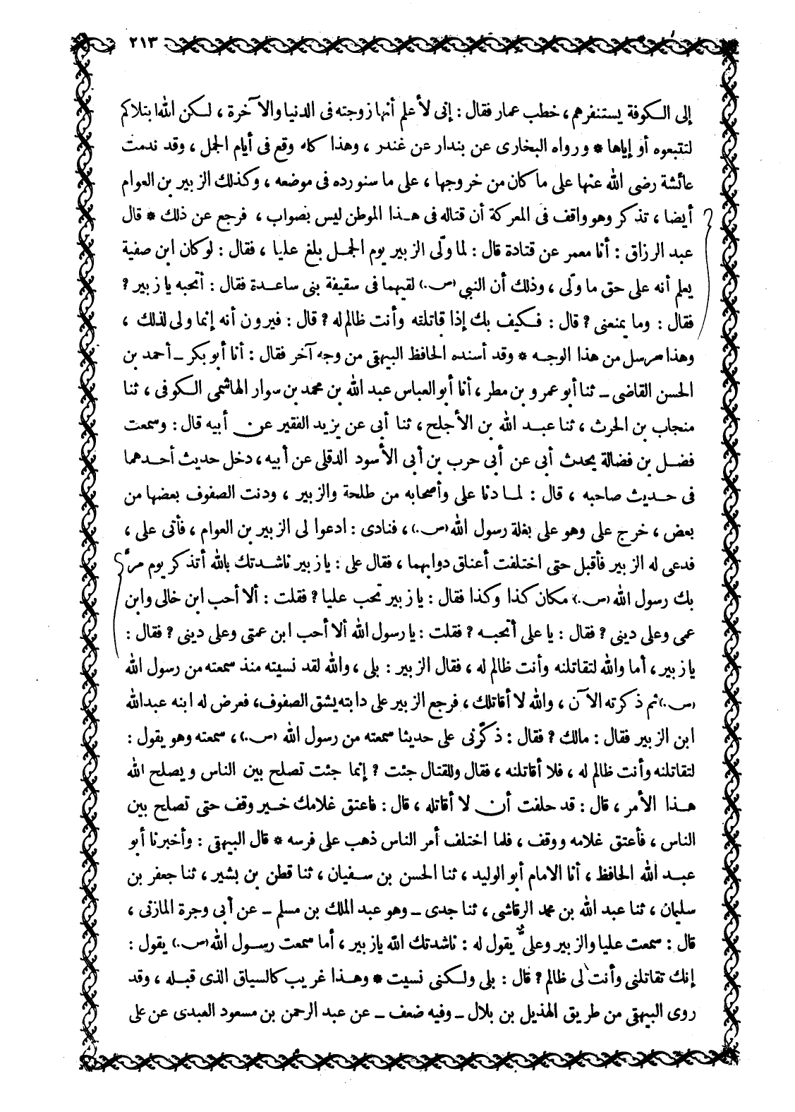 فَقَالَ: وَمَا يَمْنَعُنِي؟ قَالَ: فَكَيْفَ بِكَ إِذَا قَاتَلْتَهُ وَأَنْتَ ظَالِمٌ لَهُ؟ قَالَ: فَيَرَوْنَ أَنَّهُ إِنَّمَا وَلَّى لِذَلِكَ، وَهَذَا مُرْسَلٌ مِنْ هَذَا الْوَجْهِ وَقَدْ أَسْنَدَهُ الْحَافِظُ الْبَيْهَقِيُّ مِنْ وَجْهٍ آخَرَ فَقَالَ: أَنَا أَبُو بَكْرٍ- أَحْمَدُ بْنُ الْحَسَنِ الْقَاضِي- ثَنَا أَبُو عَمْرِو بْنُ مَطَرٍ، أَنَا أَبُو الْعَبَّاسِ عَبْدُ اللَّهِ بْنُ مُحَمَّدِ بْنِ سَوَّارٍ الْهَاشِمِيُّ الكوفي، ثنا منجاب بن الحرث، ثَنَا عَبْدُ اللَّهِ بْنُ الْأَجْلَحِ، ثَنَا أَبِي عَنْ يَزِيدَ الْفَقِيرِ عَنْ أَبِيهِ قَالَ: وَسَمِعْتُ فَضْلَ بْنَ فَضَالَةَ يُحَدِّثُ أَبِي عَنْ أَبِي حَرْبِ بْنِ أَبِي الْأَسْوَدِ الدقلى عَنْ أَبِيهِ، دَخَلَ حَدِيثَ أَحَدِهِمَا فِي حَدِيثِ صَاحِبِهِ، قَالَ: لَمَّا دَنَا عَلِيٌّ وَأَصْحَابُهُ مِنْ طَلْحَةَ وَالزُّبَيْرِ، وَدَنَتِ الصُّفُوفُ بَعْضُهَا مِنْ بَعْضٍ، خَرَجَ عَلِيٌّ وَهُوَ عَلَى بَغْلَةِ رَسُولَ اللَّهِ صَلَّى اللَّهُ عَلَيْهِ وَسَلَّمَ، فَنَادَى: ادْعُوا لِيَ الزبير بن العوام، فأتى عَلِيٌّ، فَدُعِيَ لَهُ الزُّبَيْرُ فَأَقْبَلَ حَتَّى اخْتَلَفَتْ أَعْنَاقُ دَوَابِّهِمَا، فَقَالَ عَلِيٌّ: يَا زُبَيْرُ نَاشَدْتُكَ باللَّه أَتَذْكُرُ يَوْمَ مَرَّ بِكَ رَسُولَ اللَّهِ صَلَّى اللَّهُ عَلَيْهِ وَسَلَّمَ مَكَانَ كَذَا وَكَذَا فَقَالَ: يَا زُبَيْرُ تُحِبُّ عَلِيًّا؟ فَقُلْتَ: أَلَا أُحِبُّ ابْنَ خَالِي وَابْنَ عَمِّي وَعَلَى دِينِي؟ فَقَالَ: يَا عَلِيٌّ أَتَحِبُّهُ؟ فَقُلْتُ: يَا رَسُولَ اللَّهِ أَلَا أُحِبُّ ابْنَ عَمَّتِي وَعَلَى دِينِي؟ فَقَالَ: