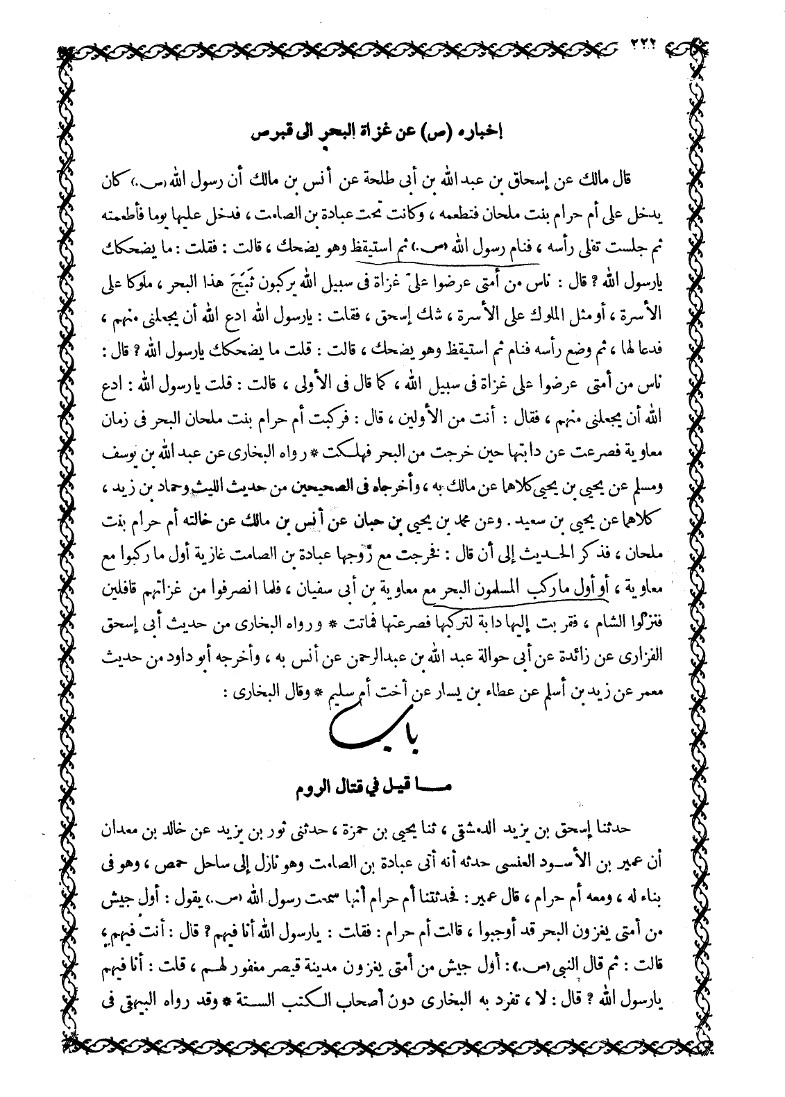 نَاسٌ مِنْ أُمَّتِي عُرِضُوا عَلَيَّ غُزَاةً فِي سَبِيلِ اللَّهِ، كَمَا قَالَ فِي الْأُولَى، قَالَتْ: قُلْتُ يَا رَسُولَ اللَّهِ: ادْعُ اللَّهَ أَنْ يَجْعَلَنِي مِنْهُمْ، فَقَالَ: أَنْتِ مِنَ الْأَوَّلِينَ، قَالَ: فَرَكِبَتْ أُمُّ حَرَامٍ بِنْتُ مِلْحَانَ الْبَحْرَ فِي زَمَانِ مُعَاوِيَةَ فَصُرِعَتْ عَنْ دَابَّتِهَا حِينَ خَرَجَتْ مِنَ الْبَحْرِ فَهَلَكَتْ رَوَاهُ الْبُخَارِيُّ عَنْ عَبْدِ اللَّهِ بْنِ يُوسُفَ وَمُسْلِمٌ عَنْ يَحْيَى بْنِ يَحْيَى كِلَاهُمَا عَنْ مَالِكٍ بِهِ، وَأَخْرَجَاهُ فِي الصَّحِيحَيْنِ مِنْ حَدِيثِ اللَّيْثِ وَحَمَّادِ بْنِ زَيْدٍ، كِلَاهُمَا عَنْ يَحْيَى بْنِ سَعِيدٍ. وَعَنْ مُحَمَّدِ بْنِ يَحْيَى بْنِ حِبَّانَ عَنْ أَنَسِ بْنِ مَالِكٍ عَنْ خَالَتِهِ أُمِّ حَرَامٍ بِنْتِ مِلْحَانَ، فَذَكَرَ الْحَدِيثِ إِلَى أَنْ قَالَ: فَخَرَجَتْ مَعَ زَوْجِهَا عُبَادَةَ بْنِ الصَّامِتِ غَازِيَةً أَوَّلَ مَا رَكِبُوا مَعَ مُعَاوِيَةَ، أَوْ أَوَّلَ مَا رَكِبَ الْمُسْلِمُونَ الْبَحْرَ مَعَ مُعَاوِيَةَ بْنِ أَبِي سُفْيَانَ، فَلَمَّا انْصَرَفُوا مِنْ غَزَاتِهِمْ قَافِلِينَ فَنَزَلُوا الشَّامَ، فَقُرِّبَتْ إِلَيْهَا دَابَّةٌ لِتَرْكَبَهَا فَصَرَعَتْهَا فَمَاتَتْ وَرَوَاهُ الْبُخَارِيُّ مِنْ حَدِيثِ أَبِي إِسَحْاقَ الْفَزَارِيِّ عَنْ زَائِدَةَ عَنْ أبى حوالة عَبْدِ اللَّهِ بْنِ عَبْدِ الرَّحْمَنِ عَنْ أَنَسٍ بِهِ، وَأَخْرَجَهُ أَبُو دَاوُدَ مِنْ حَدِيثِ مَعْمَرٍ عَنْ زَيْدِ بْنِ أَسْلَمَ عَنْ عَطَاءِ بْنِ يَسَارٍ عن أخت أم سليم وَقَالَ الْبُخَارِيُّ: