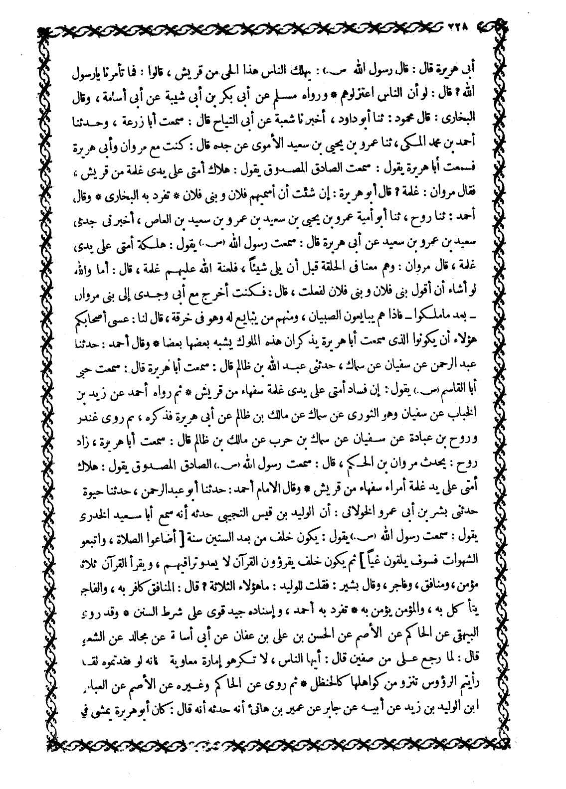 أَبِي هُرَيْرَةَ قَالَ: قَالَ رَسُولُ اللَّهِ صَلَّى اللَّهُ عَلَيْهِ وَسَلَّمَ: يُهْلِكُ النَّاسَ هَذَا الْحَيُّ مِنْ قُرَيْشٍ، قَالُوا: فَمَا تَأْمُرُنَا يَا رَسُولَ اللَّهِ؟ قَالَ: لَوْ أَنَّ النَّاسَ اعْتَزَلُوهُمْ وَرَوَاهُ مُسْلِمٌ عَنْ أَبِي بَكْرِ بْنِ أَبِي شَيْبَةَ عَنْ أَبِي أُسَامَةَ، وَقَالَ الْبُخَارِيُّ: قَالَ مَحْمُودٌ: ثَنَا أَبُو دَاوُدَ، أَخْبَرَنَا شُعْبَةُ عَنْ أَبِي الْتَّيَّاحِ قَالَ: سَمِعْتُ أَبَا زُرْعَةَ، وَحَدَّثَنَا أَحْمَدُ بْنُ مُحَمَّدٍ الْمَكِّيُّ، ثَنَا عَمْرُو بْنُ يَحْيَى بْنِ سَعِيدٍ الْأُمَوِيُّ عَنْ جَدِّهِ قَالَ: كُنْتُ مَعَ مَرْوَانَ وَأَبِي هُرَيْرَةَ فَسَمِعْتُ أَبَا هُرَيْرَةَ يَقُولُ: سَمِعْتُ الصَّادِقَ الْمَصْدُوقَ يَقُولُ: هَلَاكُ أُمَّتِي عَلَى يَدَيْ غِلْمَةٍ مِنْ قُرَيْشٍ، فَقَالَ مَرْوَانُ: غِلْمَةٌ؟ قَالَ أَبُو هُرَيْرَةَ: إِنْ شِئْتَ أَنْ أسميهم فُلَانٍ وَبَنِي فُلَانٍ تَفَرَّدَ بِهِ الْبُخَارِيُّ وَقَالَ أَحْمَدُ: ثَنَا رَوْحٌ، ثَنَا أَبُو أُمَيَّةَ عَمْرُو بْنُ يَحْيَى بْنِ سَعِيدُ بْنُ عَمْرِو بْنِ سَعِيدِ بْنِ الْعَاصِ، أَخْبَرَنِي جَدِّي سَعِيدُ بْنُ عَمْرِو بْنِ سَعِيدٍ عَنْ أَبِي هُرَيْرَةَ قَالَ: سَمِعْتُ رَسُولَ اللَّهِ صَلَّى اللَّهُ عَلَيْهِ وَسَلَّمَ يَقُولُ: هَلَكَةُ أُمَّتِي عَلَى يَدَيْ غِلْمَةٍ، قَالَ مروان: وهم مَعَنَا فِي الْحَلْقَةِ قَبْلَ أَنْ يَلِيَ شَيْئًا، فَلَعْنَةُ اللَّهِ عَلَيْهِمْ غِلْمَةً، قَالَ: أَمَا وَاللَّهِ لَوْ أَشَاءُ أَنْ أَقُولَ بَنِي فُلَانٍ وَبَنِي فُلَانٍ لَفَعَلْتُ، قَالَ: فَكُنْتُ أَخْرُجُ مَعَ أَبِي وَجَدِّي إِلَى بَنِي مَرْوَانَ- بَعْدَ مَا مَلَكُوا- فَإِذَا هُمْ يُبَايِعُونَ الصِّبْيَانَ، وَمِنْهُمْ مَنْ يُبَايَعُ لَهُ وَهُوَ فِي خِرْقَةٍ، قَالَ لنا: عَسَى أَصْحَابُكُمْ هَؤُلَاءِ أَنْ يَكُونُوا الَّذِي سَمِعْتُ أبا هريرة يذكران هَذِهِ الْمُلُوكَ يُشْبِهُ بَعْضُهَا بَعْضًا وَقَالَ أَحْمَدُ: حَدَّثَنَا عَبْدُ الرَّحْمَنِ عَنْ سُفْيَانَ عَنْ سِمَاكٍ، حَدَّثَنِي عَبْدُ اللَّهِ بْنُ ظَالِمٍ قَالَ: سَمِعْتُ أَبَا هُرَيْرَةَ قَالَ: سَمِعْتُ حِبِّي أَبَا الْقَاسِمِ صَلَّى اللَّهُ عَلَيْهِ وَسَلَّمَ يَقُولُ: إِنَّ فَسَادَ أُمَّتِي عَلَى يَدَيْ غِلْمَةٍ سُفَهَاءَ مِنْ قُرَيْشٍ ثم رواه أحمد عن زيد بن الخباب عَنْ سُفْيَانَ وَهُوَ الثَّوْرِيُّ عَنْ سِمَاكِ عَنْ مَالِكِ بْنِ ظَالِمٍ عَنْ أَبِي هُرَيْرَةِ فَذَكَرَهُ، ثم روى غندر وروح بن عبادة عَنْ سُفْيَانَ عَنْ سِمَاكِ بْنِ حَرْبٍ عَنْ مَالِكِ بْنِ ظَالِمٍ قَالَ: سَمِعْتُ أَبَا هُرَيْرَةَ، زَادَ رَوْحٌ: يُحَدِّثُ مَرْوَانَ بْنَ الْحَكَمِ، قَالَ: سَمِعْتُ رَسُولَ اللَّهِ صَلَّى اللَّهُ عَلَيْهِ وَسَلَّمَ الصَّادِقَ الْمَصْدُوقَ يقول: هلاك أمتى على يد غِلْمَةٍ أُمَرَاءَ سُفَهَاءَ مِنْ قُرَيْشٍ وَقَالَ الْإِمَامُ أَحْمَدُ: حَدَّثَنَا أَبُو عَبْدِ الرَّحْمَنِ، حَدَّثَنَا حَيْوَةُ، حَدَّثَنِي بِشْرُ بْنُ أَبِي عَمْرٍو الْخَوْلَانِيُّ: أَنَّ الْوَلِيدَ بْنَ قَيْسٍ التُّجِيبِيَّ حَدَّثَهُ أَنَّهُ سَمِعَ أَبَا سَعِيدٍ الْخُدْرِيَّ يَقُولُ: سَمِعْتُ رَسُولَ اللَّهِ صَلَّى اللَّهُ عَلَيْهِ وَسَلَّمَ يَقُولُ: يَكُونُ خَلْفٌ مِنْ بَعْدِ السِّتِّينَ سَنَةً (أَضَاعُوا الصَّلَاةَ، وَاتَّبَعُوا الشَّهَوَاتِ فَسَوْفَ يَلْقَوْنَ غَيًّا) ثُمَّ يَكُونُ خَلْفٌ يَقْرَءُونَ الْقُرْآنَ لَا يَعْدُو تَرَاقِيَهُمْ، وَيَقْرَأُ الْقُرْآنَ ثَلَاثَةٌ مُؤْمِنٌ، وَمُنَافِقٌ، وَفَاجِرٌ، وَقَالَ بَشِيرٌ: فَقُلْتُ لِلْوَلِيدِ: مَا هَؤُلَاءِ الثَّلَاثَةُ؟ قَالَ: الْمُنَافِقُ كَافِرٌ بِهِ، وَالْفَاجِرُ يَتَأَكَّلُ بِهِ، وَالْمُؤْمِنُ يُؤْمِنُ بِهِ تَفَرَّدَ بِهِ 