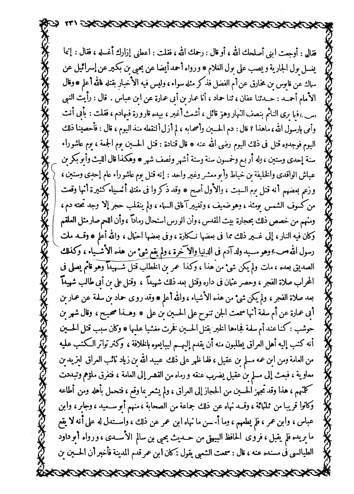 فَقَالَ: أَوْجَعْتِ ابْنِي أَصْلَحَكِ اللَّهُ، أَوْ قَالَ: رَحِمَكِ اللَّهُ، فَقُلْتُ: أَعْطِنِي إِزَارَكُ أَغْسِلْهُ، فَقَالَ: إِنَّمَا يُغْسَلُ بَوْلُ الْجَارِيَةِ وَيُصَبُّ عَلَى بَوْلِ الْغُلَامِ وَرَوَاهُ أَحْمَدُ أَيْضًا عَنْ يَحْيَى بْنِ بُكَيْرٍ عَنْ إِسْرَائِيلَ عَنْ سِمَاكٍ عَنْ قَابُوسَ بْنِ مُخَارِقٍ عَنْ أُمِّ الْفَضْلِ فَذَكَرَ مِثْلَهُ سَوَاءً، وَلَيْسَ فِيهِ الْإِخْبَارُ بِقَتْلِهِ فاللَّه أَعْلَمُ وَقَالَ الْإِمَامُ أَحْمَدُ: حَدَّثَنَا عَفَّانُ، ثَنَا حَمَّادٌ، أنا عمار بن أبى عمارة عَنِ ابْنِ عَبَّاسٍ. قَالَ: رَأَيْتُ النَّبِيَّ صَلَّى اللَّهُ عَلَيْهِ وَسَلَّمَ فِيمَا يَرَى النَّائِمُ بِنِصْفِ النَّهَارِ وَهُوَ قَائِلٌ، أَشْعَثَ أَغْبَرَ، بِيَدِهِ قَارُورَةٌ فِيهَا دَمٌ، فَقُلْتُ: بِأَبِي أَنْتَ وَأُمِّي يَا رَسُولَ اللَّهِ، مَا هذا؟ قال: دَمُ الْحُسَيْنِ وَأَصْحَابِهِ، لَمْ أَزَلْ أَلْتَقِطُهُ مُنْذُ الْيَوْمِ، قَالَ: فَأَحْصَيْنَا ذَلِكَ الْيَوْمَ فَوَجَدُوهُ قُتِلَ فِي ذَلِكَ الْيَوْمِ رَضِيَ اللَّهُ عَنْهُ قَالَ قَتَادَةُ: قُتِلَ الْحُسَيْنُ يَوْمَ الْجُمُعَةِ، يَوْمَ عَاشُورَاءَ سَنَةَ إِحْدَى وَسِتِّينَ، وَلَهُ أَرْبَعٌ وَخَمْسُونَ سَنَةً وَسِتَّةُ أَشْهُرٍ وَنِصْفُ شَهْرٍ وَهَكَذَا قَالَ اللَّيْثُ وأبو بكر بن عياش الواقدي والخليفة بْنُ خَيَّاطٍ وَأَبُو مَعْشَرٍ وَغَيْرُ وَاحِدٍ: أَنَّهُ قتل يوم عاشوراء عام إحدى وَسِتِّينَ، وَزَعَمَ بَعْضُهُمْ أَنَّهُ قُتِلَ يَوْمَ السَّبْتِ، وَالْأَوَّلُ أَصَحُّ وَقَدْ ذَكَرُوا فِي مَقْتَلِهِ أَشْيَاءَ كَثِيرَةً أَنَّهَا وَقَعَتْ مِنْ كُسُوفِ الشَّمْسِ يَوْمَئِذٍ، وَهُوَ ضَعِيفٌ، وَتَغْيِيرُ آفَاقِ السَّمَاءِ، وَلَمْ يَنْقَلِبْ حَجَرٌ إِلَّا وُجِدَ تَحْتَهُ دَمٌ، وَمِنْهُمْ مَنْ خَصَّصَ ذَلِكَ بِحِجَارَةِ بَيْتِ الْمَقْدِسِ، وَأَنَّ الْوَرْسَ اسْتَحَالَ رَمَادًا، وَأَنَّ اللَّحْمَ صَارَ مِثْلَ الْعَلْقَمِ وَكَانَ فِيهِ النَّارُ، إِلَى غَيْرِ ذَلِكَ مِمَّا فِي بَعْضِهَا نَكَارَةٌ، وَفِي بَعْضِهَا احْتِمَالٌ، وَاللَّهُ أَعْلَمُ وَقَدْ مَاتَ رَسُولُ اللَّهِ صَلَّى اللَّهُ عَلَيْهِ وَسَلَّمَ وَهُوَ سَيِّدُ وَلَدِ آدَمَ فِي الدُّنْيَا وَالْآخِرَةِ، وَلَمْ يَقَعْ شَيْءٌ مِنْ هَذِهِ الْأَشْيَاءِ، وَكَذَلِكَ الصِّدِّيقُ بَعْدَهُ، مَاتَ وَلَمْ يَكُنْ شَيْءٌ مِنْ هَذَا، وَكَذَا عُمَرُ بْنُ الْخَطَّابِ قُتِلَ شَهِيدًا وَهُوَ قَائِمٌ يُصَلِّي فِي الْمِحْرَابِ صَلَاةَ الْفَجْرِ، وَحُصِرَ عُثْمَانُ فِي دَارِهِ وَقُتِلَ بَعْدَ ذَلِكَ شَهِيدًا، وَقُتِلَ عَلِيُّ بْنُ أَبِي طالب شهيدا بعد صَلَاةِ الْفَجْرِ، وَلَمْ يَكُنْ شَيْءٌ مِنْ هَذِهِ الْأَشْيَاءِ، وَاللَّهُ أَعْلَمُ وَقَدْ رَوَى حَمَّادُ بْنُ سَلَمَةَ عَنْ عَمَّارِ بْنِ أَبِي عمارة عَنْ أُمِّ سَلَمَةَ أَنَّهَا سَمِعَتِ الْجِنَّ تَنُوحُ عَلَى الْحُسَيْنِ بْنِ عَلِيٍّ وَهَذَا صَحِيحٌ، وَقَالَ شَهْرُ بْنُ حَوْشَبٍ: كُنَّا عِنْدَ أُمِّ سَلَمَةَ فَجَاءَهَا الْخَبَرُ بِقَتْلِ الْحُسَيْنِ فَخَرَّتْ مَغْشِيًّا عَلَيْهَا وَكَانَ سَبَبُ قَتْلِ الْحُسَيْنِ أَنَّهُ كَتَبَ إِلَيْهِ أهل العراق يطلبون منه أن يقدم إليهم لِيُبَايِعُوهُ بِالْخِلَافَةِ، وَكَثُرَ تَوَاتُرُ الْكُتُبِ عَلَيْهِ مِنَ الْعَامَّةِ وَمِنَ ابْنِ عَمِّهِ مُسْلِمِ بْنِ عَقِيلٍ، فَلَمَّا ظَهَرَ عَلَى ذَلِكَ عُبَيْدُ اللَّهِ بْنُ زياد نائب العراق ليزيد بن معاوية، فبعث إلى مسلّم بن عقيل يضرب عُنُقَهُ وَرَمَاهُ مِنَ الْقَصْرِ إِلَى الْعَامَّةِ، فَتَفَرَّقَ مَلَؤُهُمْ وَتَبَدَّدَتْ كَلِمَتُهُمْ، هَذَا وَقَدْ تَجَهَّزَ الْحُسَيْنُ مِنَ الْحِجَازِ إِلَى الْعِرَاقِ، وَلَمْ يَشْعُرْ بِمَا وَقَعَ، فَتَح