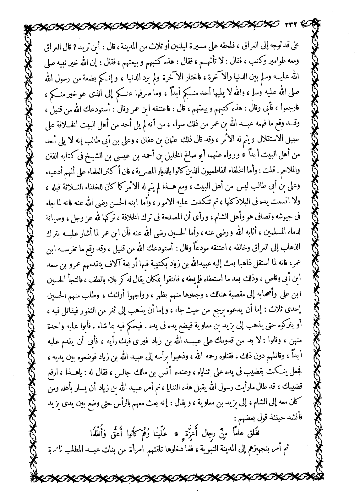 عَلِيٍّ قَدْ تَوَجَّهَ إِلَى الْعِرَاقِ، فَلَحِقَهُ عَلَى مسيرة ليلتين أو ثلاث من المدينة، قال: أَيْنَ تُرِيدُ؟ قَالَ الْعِرَاقَ وَمَعَهُ طَوَامِيرُ وَكُتُبٌ، فَقَالَ: لَا تَأْتِهِمْ، فَقَالَ: هَذِهِ كُتُبُهُمْ وَبَيْعَتُهُمْ، فَقَالَ: إِنَّ اللَّهَ خَيَّرَ نَبِيَّهُ صَلَّى اللَّهُ عَلَيْهِ وَسَلَّمَ بَيْنَ الدُّنْيَا وَالْآخِرَةِ، فَاخْتَارَ الْآخِرَةَ وَلَمْ يُرِدِ الدُّنْيَا، وَإِنَّكُمْ بَضْعَةٌ مِنْ رَسُولِ اللَّهِ صَلَّى اللَّهُ عَلَيْهِ وَسَلَّمَ، وَاللَّهِ لَا يَلِيهَا أَحَدٌ مِنْكُمْ أَبَدًا، وَمَا صَرَفَهَا عَنْكُمْ إلى الّذي هو خير منكم، فَارْجِعُوا، فَأَبَى وَقَالَ: هَذِهِ كُتُبُهُمْ وَبَيْعَتُهُمْ، قَالَ: فَاعْتَنَقَهُ ابْنُ عُمَرَ وَقَالَ: أَسْتَوْدِعُكَ اللَّهَ مِنْ قَتِيلٍ، وَقَدْ وَقَعَ مَا فَهِمَهُ عَبْدُ اللَّهِ بْنُ عُمَرَ مِنْ ذَلِكَ سَوَاءً، مِنْ أَنَّهُ لَمْ يَلِ أَحَدٌ مِنْ أَهْلِ الْبَيْتِ الْخِلَافَةَ عَلَى سَبِيلِ الِاسْتِقْلَالِ وَيَتِمَّ لَهُ الْأَمْرُ، وَقَدْ قَالَ ذَلِكَ عُثْمَانُ بْنُ عَفَّانَ، وَعَلِيُّ بْنُ أَبِي طَالِبٍ أَنَّهُ لَا يَلِي أَحَدٌ مِنْ أهل البيت أبدا ورواه عنهما أبو صالح الخليل بْنُ أَحْمَدَ بْنِ عِيسَى بْنِ الشَّيْخِ فِي كِتَابِهِ الْفِتَنِ وَالْمَلَاحِمِ. قُلْتُ: وَأَمَّا الْخُلَفَاءُ الْفَاطِمِيُّونَ الَّذِينَ كَانُوا بِالدِّيَارِ الْمِصْرِيَّةِ، فَإِنَّ أَكْثَرَ الْعُلَمَاءِ عَلَى أَنَّهُمْ أَدْعِيَاءُ وَعَلِيُّ بْنُ أَبِي طَالِبٍ ليس مِنْ أَهْلِ الْبَيْتِ، وَمَعَ هَذَا لَمْ يَتِمَّ لَهُ الْأَمْرُ كَمَا كَانَ لِلْخُلَفَاءِ الثَّلَاثَةِ قَبْلَهُ، وَلَا اتَّسَعَتْ يَدُهُ فِي الْبِلَادِ كُلِّهَا، ثُمَّ تَنَكَّدَتْ عَلَيْهِ الْأُمُورُ، وَأَمَّا ابْنُهُ الْحَسَنُ رَضِيَ اللَّهُ عَنْهُ فَإِنَّهُ لَمَّا جَاءَ فِي جُيُوشِهِ وَتَصَافَى هُوَ وَأَهْلُ الشَّامِ، وَرَأَى أَنَّ الْمَصْلَحَةَ فِي تَرْكِ الْخِلَافَةِ، تَرَكَهَا للَّه عَزَّ وَجَلَّ، وصيانة لدماء المسلمين، أثابه الله ورضى الله عَنْهُ، وَأَمَّا الْحُسَيْنُ رَضِيَ اللَّهُ عَنْهُ فَإِنَّ ابْنُ عُمَرَ لَمَّا أَشَارَ عَلَيْهِ بِتَرْكِ الذَّهَابِ إِلَى الْعِرَاقِ وَخَالَفَهُ، اعْتَنَقَهُ مُوَدِّعًا وَقَالَ: أَسْتَوْدِعُكَ اللَّهَ مِنْ قَتِيلٍ، وَقَدْ وَقَعَ مَا تَفَرَّسَهُ ابْنُ عُمَرَ، فَإِنَّهُ لَمَّا اسْتَقَلَّ ذَاهِبًا بَعَثَ إِلَيْهِ عُبَيْدُ اللَّهِ بْنُ زِيَادٍ بِكَتِيبَةٍ فِيهَا أربعة آلاف يتقدمهم عمرو بن سعد ابن أَبِي وَقَاصٍّ، وَذَلِكَ بَعْدَ مَا اسْتَعْفَاهُ فَلَمْ يُعْفِهِ، فَالْتَقَوْا بِمَكَانٍ يُقَالُ لَهُ كَرْبَلَاءُ بِالطَّفِّ، فالتجأ الحسين ابن عَلِيٍّ وَأَصْحَابُهُ إِلَى مَقْصَبَةٍ هُنَالِكَ، وَجَعَلُوهَا مِنْهُمْ بِظَهْرٍ، وَوَاجَهُوا أُولَئِكَ، وَطَلَبَ مِنْهُمُ الْحُسَيْنُ إِحْدَى ثَلَاثٍ: إِمَّا أَنْ يَدَعُوهُ يَرْجِعُ مِنْ حَيْثُ جَاءَ، وَإِمَّا أَنْ يَذْهَبَ إِلَى ثَغْرٍ مِنَ الثُّغُورِ فَيُقَاتِلَ فِيهِ، أَوْ يَتْرُكُوهُ حَتَّى يَذْهَبَ إِلَى يَزِيدَ بْنِ مُعَاوِيَةَ فَيَضَعَ يَدَهُ فِي يَدِهِ. فَيَحْكُمَ فِيهِ بِمَا شَاءَ، فَأَبَوْا عَلَيْهِ وَاحِدَةً مِنْهُنَّ، وَقَالُوا: لَا بُدَّ مِنْ قُدُومِكَ عَلَى عُبَيْدِ اللَّهِ بْنِ زِيَادٍ فَيَرَى فِيكَ رَأْيَهُ، فَأَبِي أَنْ يَقَدَمَ عَلَيْهِ أَبَدًا، وَقَاتَلَهُمْ دُونَ ذَلِكَ، فَقَتَلُوهُ رَحِمَهُ اللَّهُ، وَذَهَبُوا بِرَأْسِهِ إِلَى عُبَيْدِ اللَّهِ بْنِ زِيَادٍ فَوَضَعُوهُ بَيْنَ يَدَيْهِ، فَجَعَلَ يَنْكُتُ بِقَضِيبٍ فِي يَدِهِ عَلَى ثَنَايَاهُ، وَعِنْدَهُ أَنَسُ بْنُ مَالِكٍ جَالِسٌ، فَقَالَ لَهُ: يَا هَذَا، ارْفَعْ قَضِيبَكَ، قَدْ طَالَ مَا رَأَيْتُ رَسُولَ اللَّهِ يَقْبَلُ